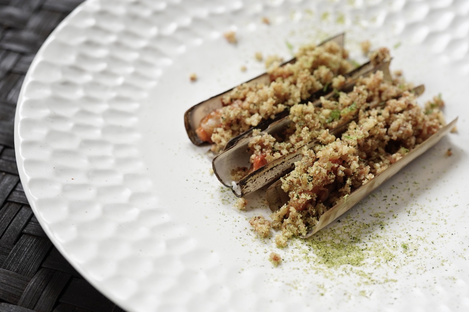 • RAZOR CLAMRazor calm, fermented tomato, holybasil crumble