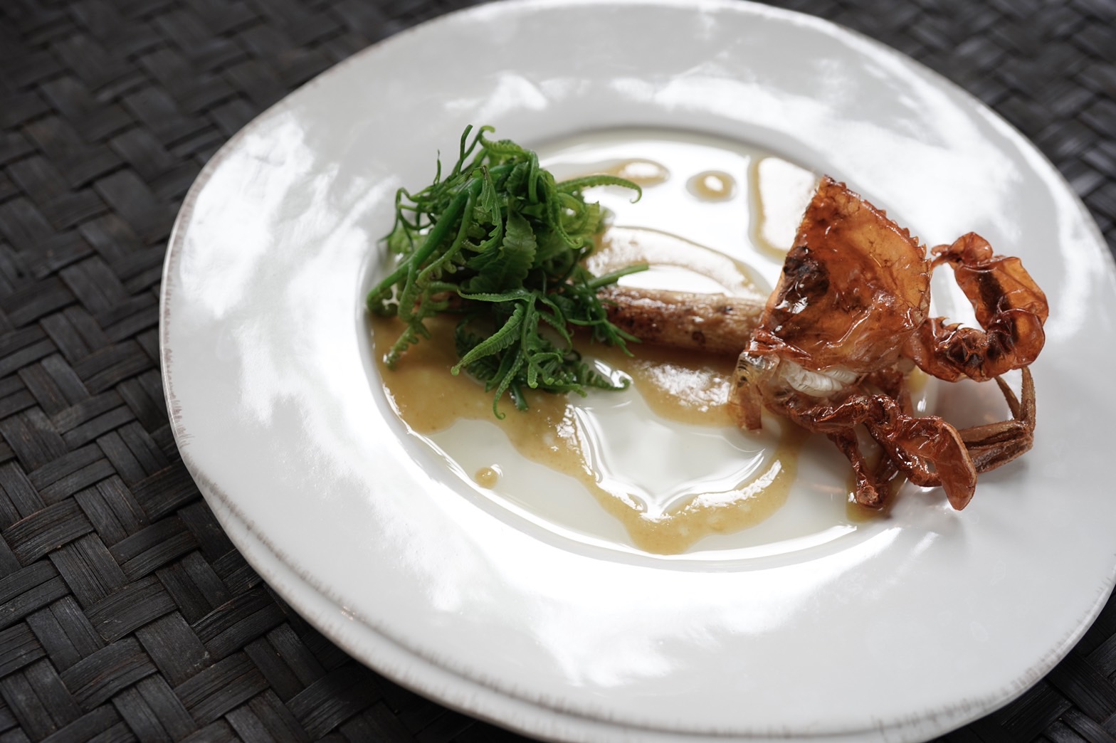 Soft shell crabs are fried to a lovely outer crisp, leaving the meat all juicy in home made coal oil which is mixed with fermented soybean dressing and white sesame, reminiscent of some of the classic Japanese sesame-focused sauces. The vegetables are all foraged and guaranteed fresh and delicious.