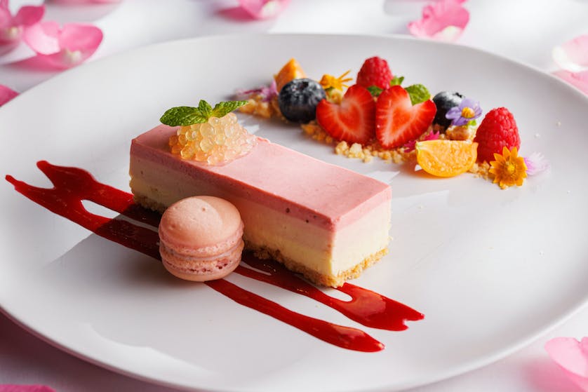 End the meal with the strawberry cheese cake, a classic dessert served with mixed berries, macaron, crumbles and raspberry sauce.