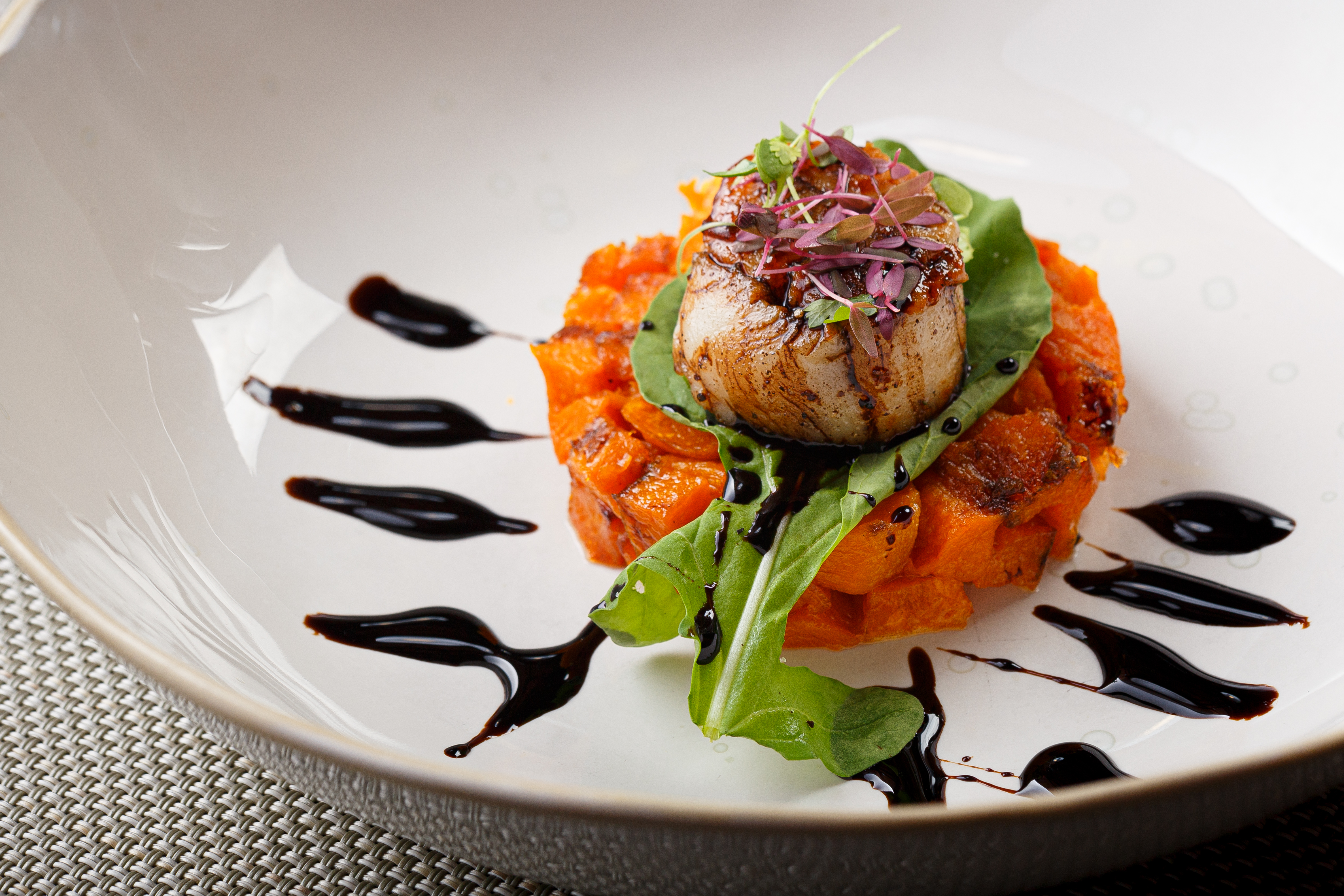Next, the seared scallops with butternut squash and balsamic reduction arrives, light bites bursting with flavor.
