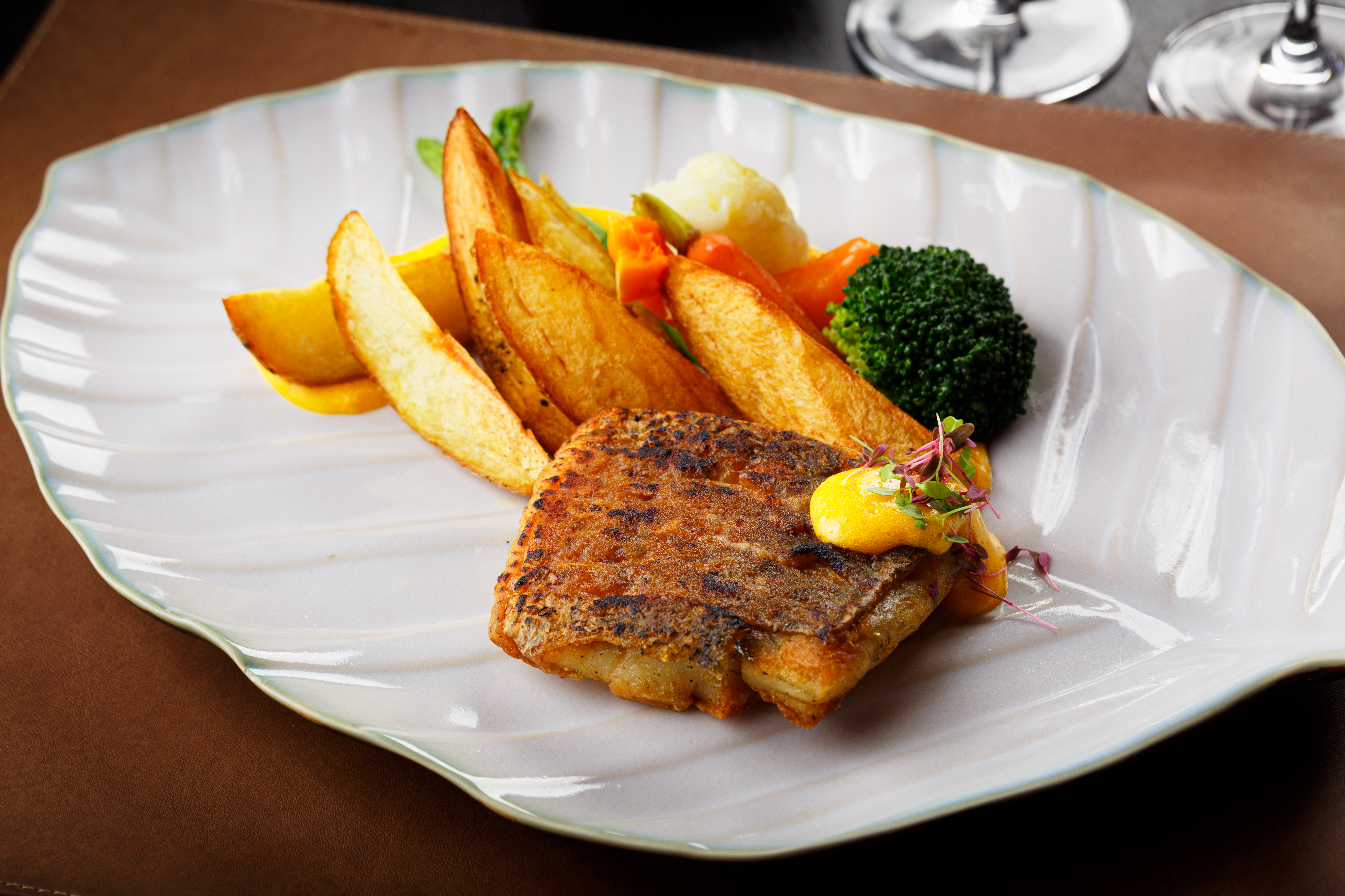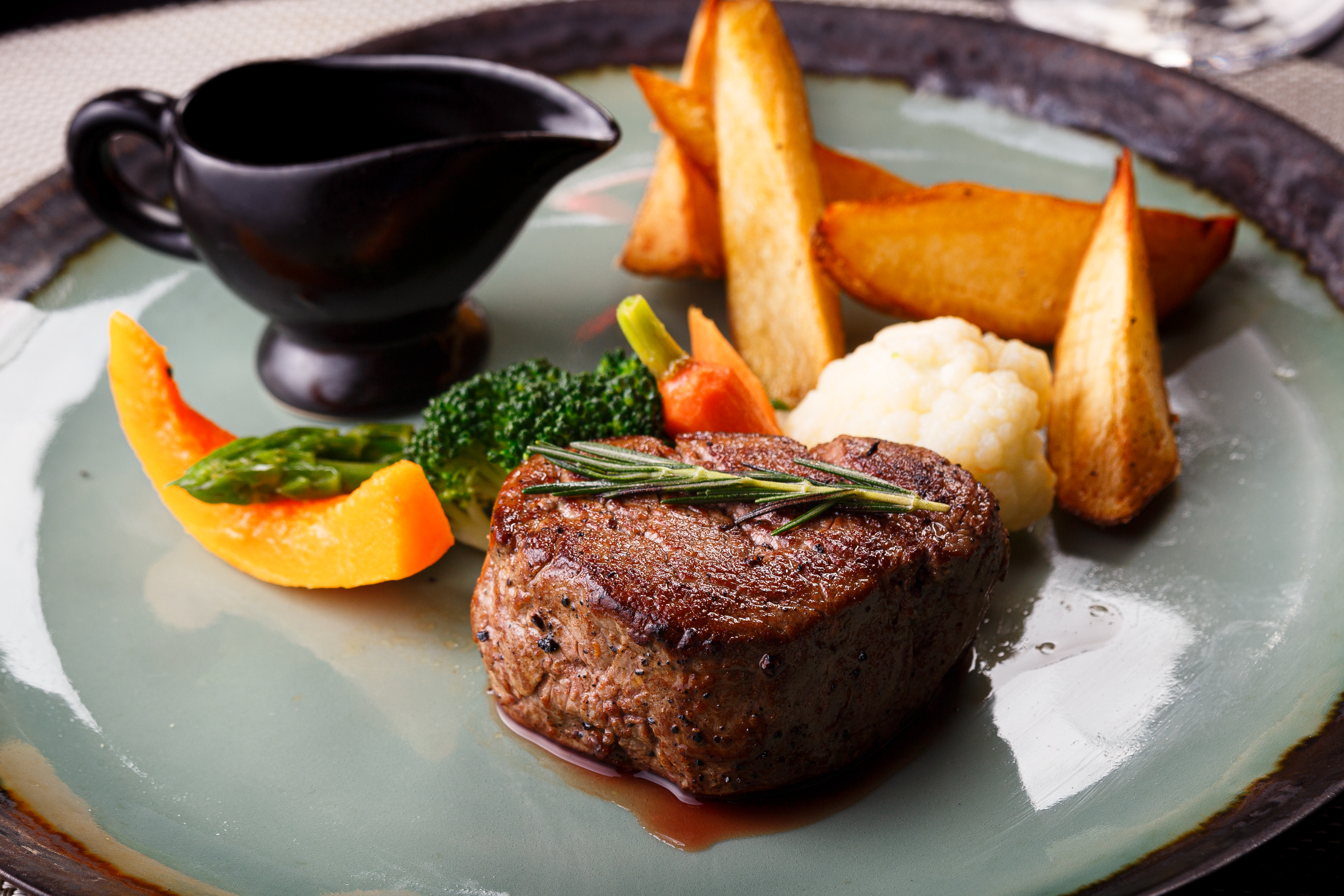 and ready to dig into the pan roasted marinated sea bass with miso sauce served with potato wedges, roasted vegetables and red wine jus. Next is the heartier veal Angus beef serve with potato wedges, roasted vegetables and red wine jus.