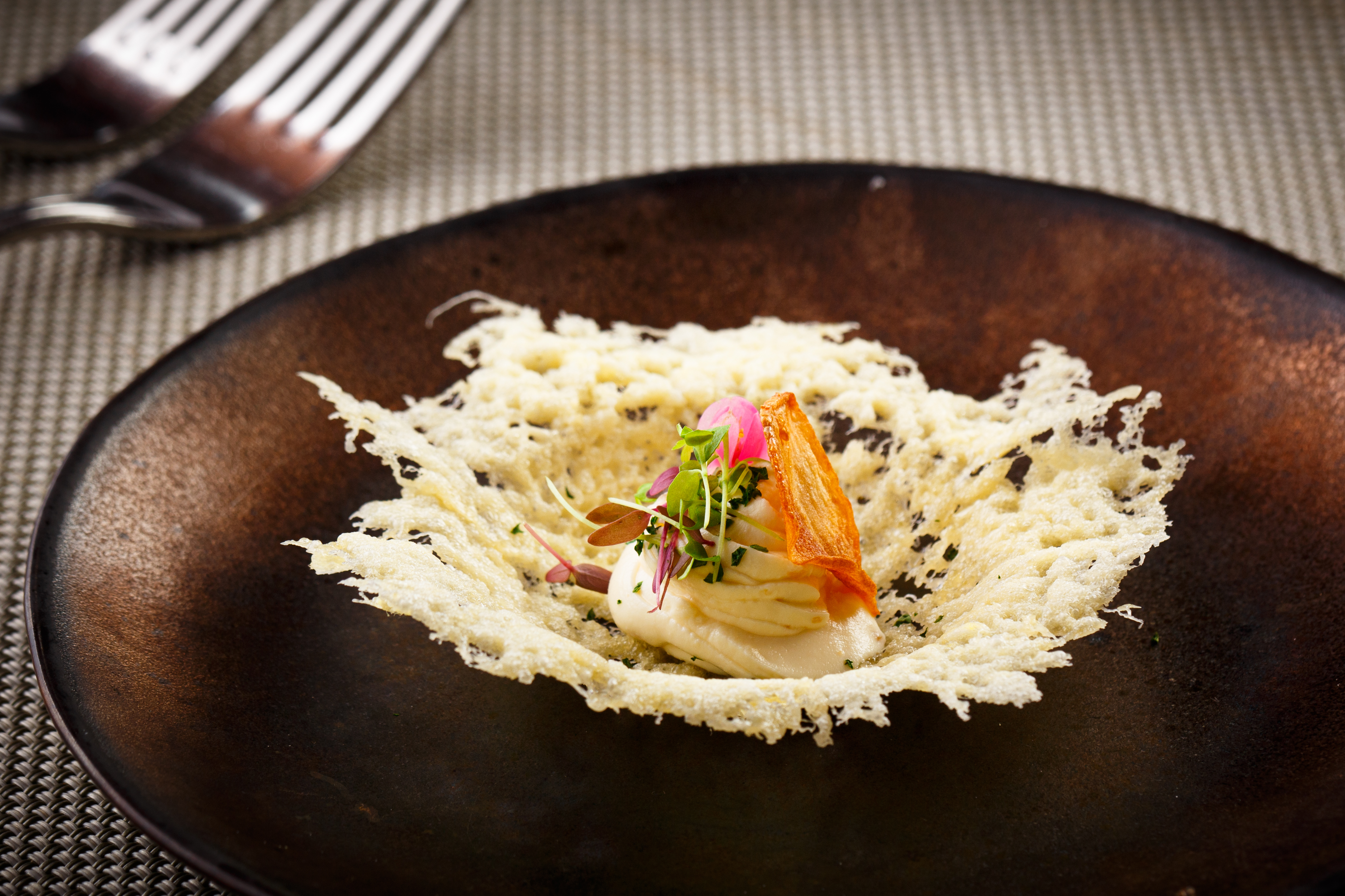 Start with a nibble or two on some tasty Parmesan chips with cream cheese and garlic crisps.