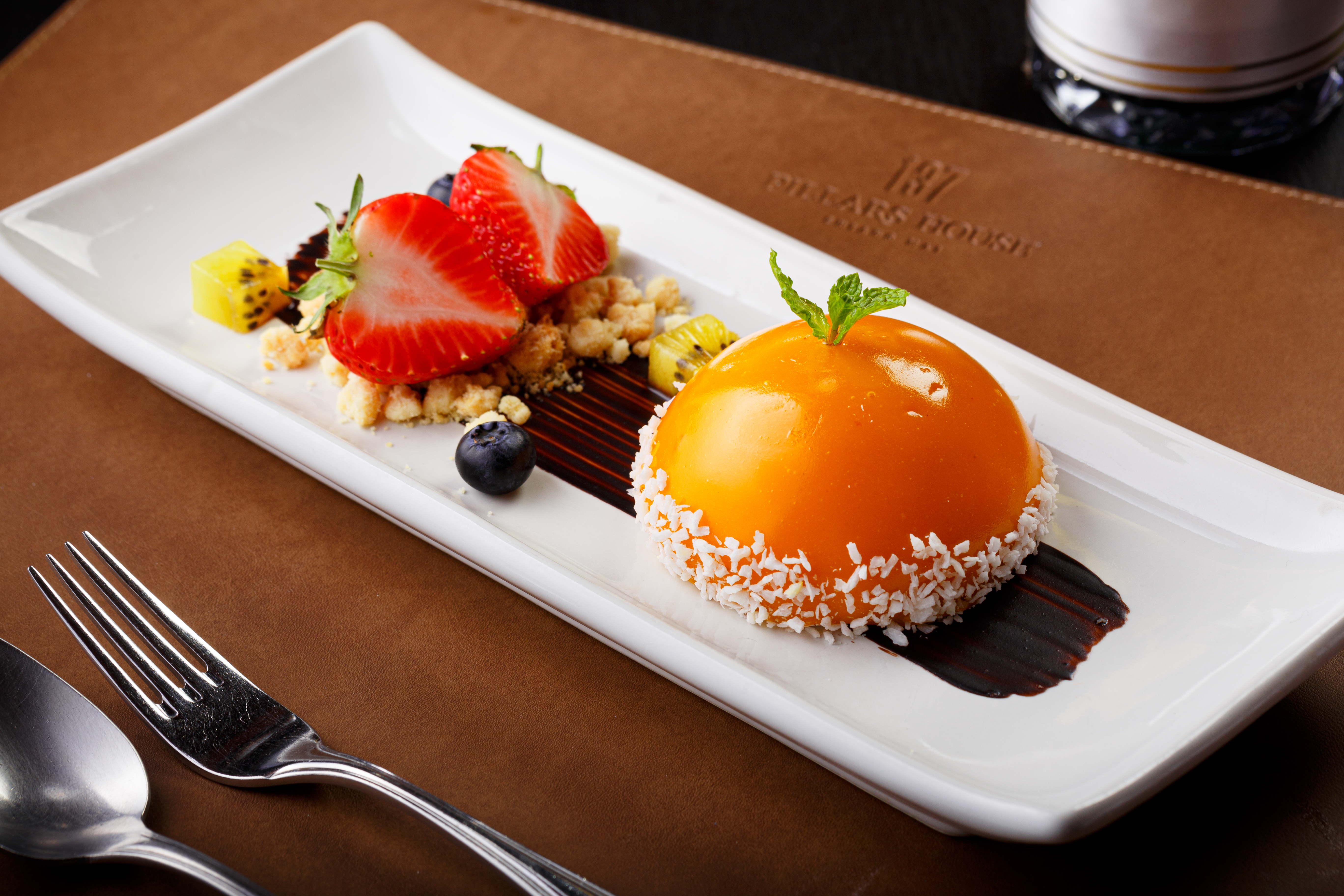 End the meal with a mango dome stuffed with mango mousse and jelly served with crumble, fresh blueberries and strawberries.
