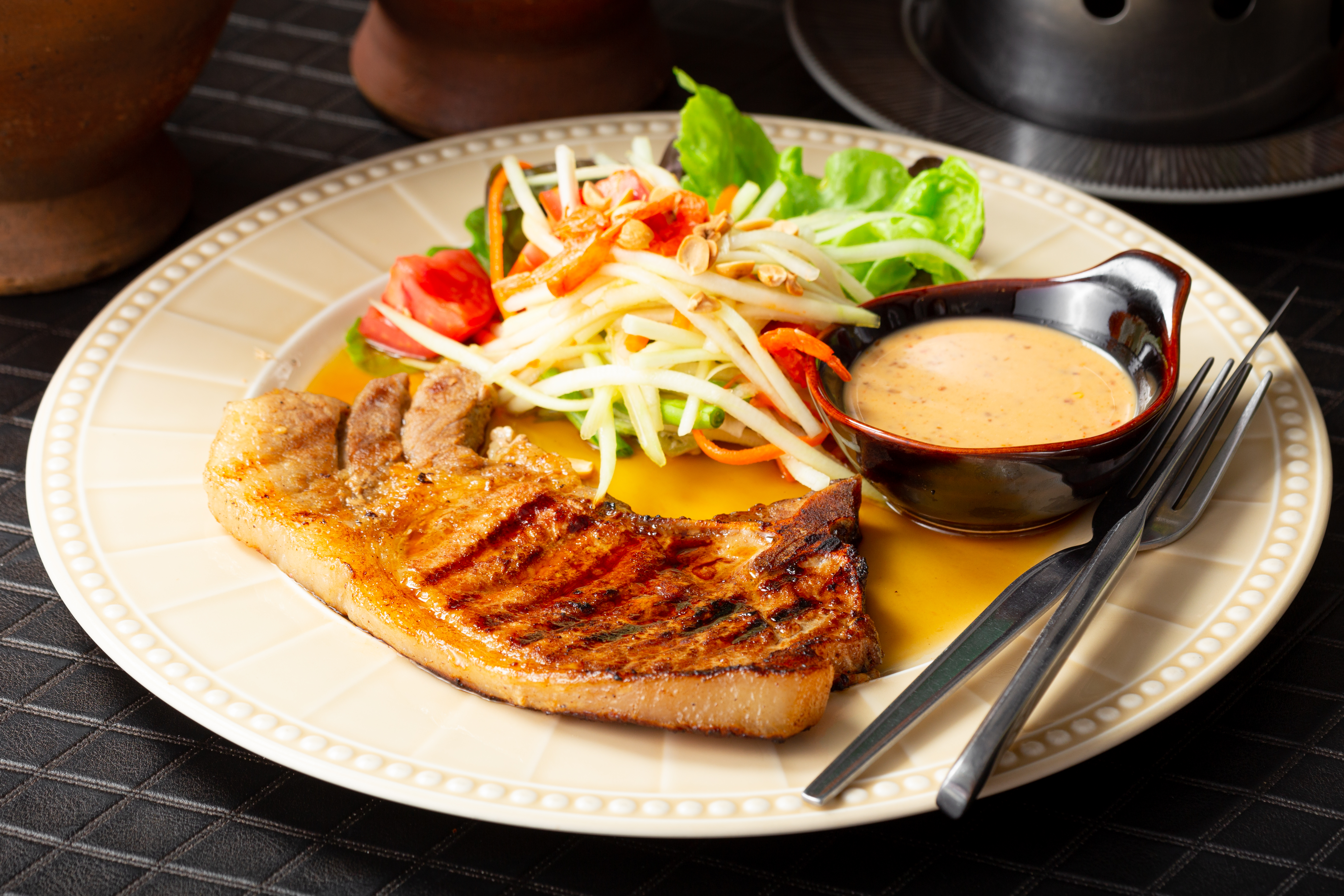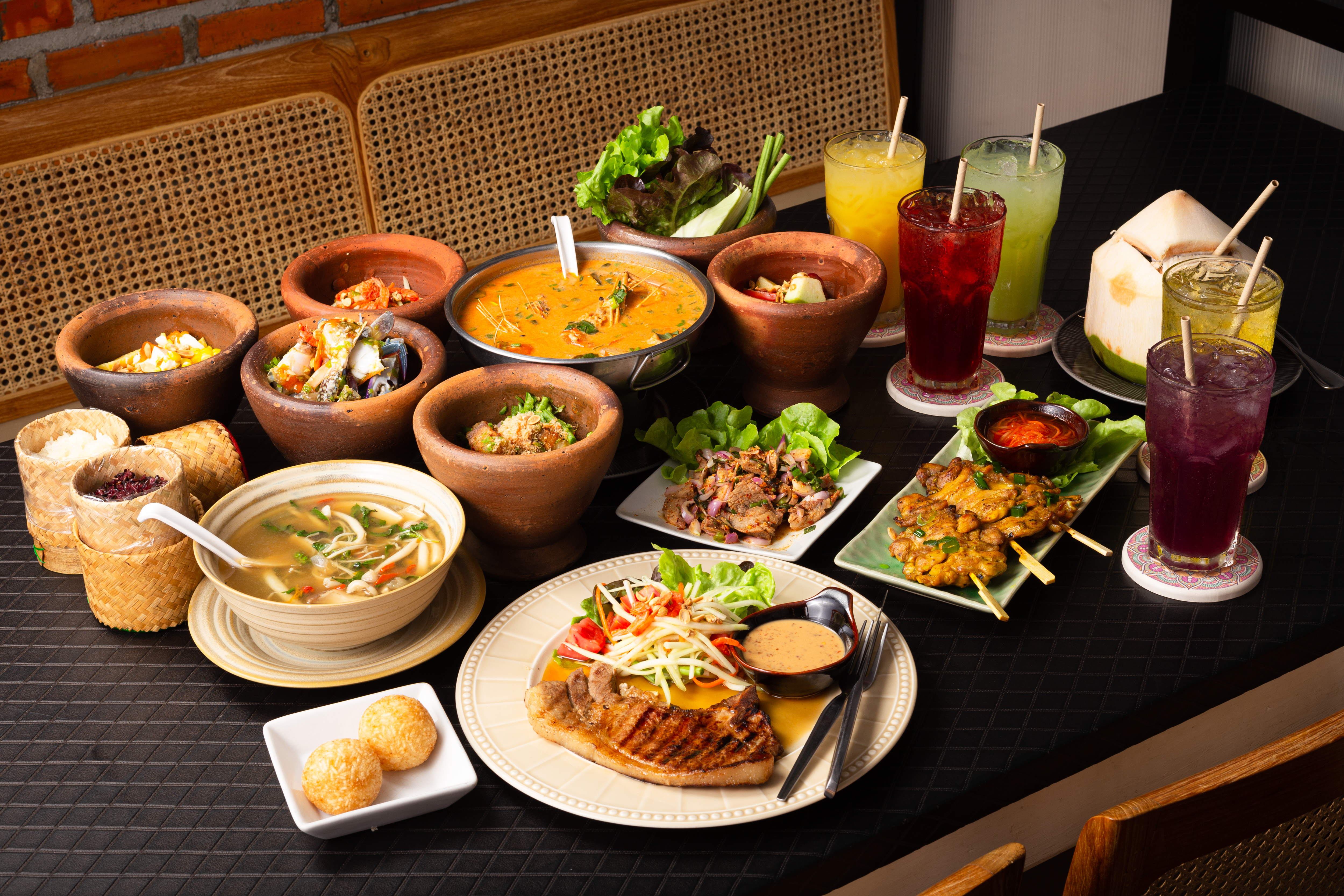 Som tum is best enjoyed accompanied by sticky rice, grilled chicken, sun dried pork and a number of other ubiquitous dishes which are all on the menu.