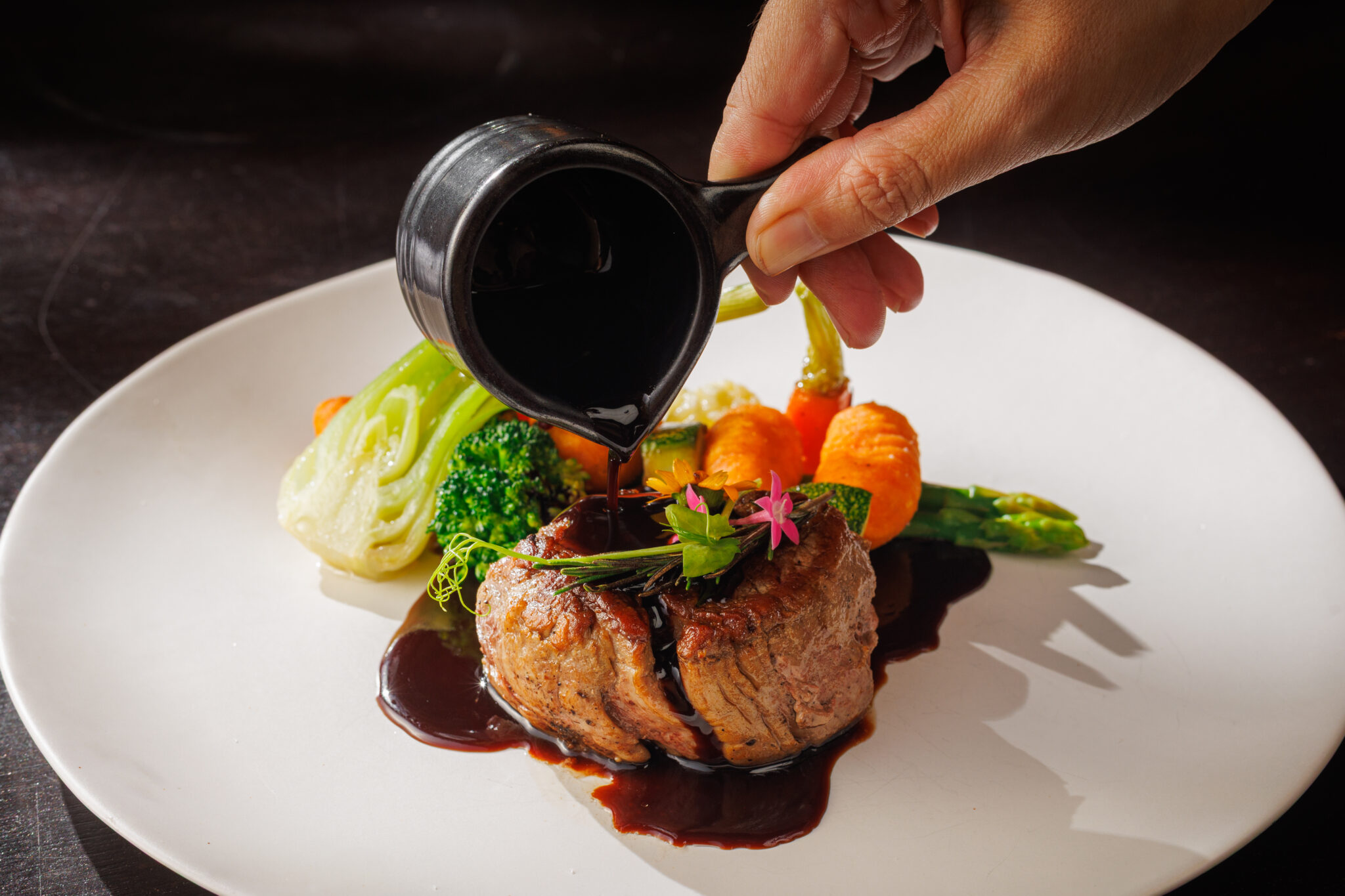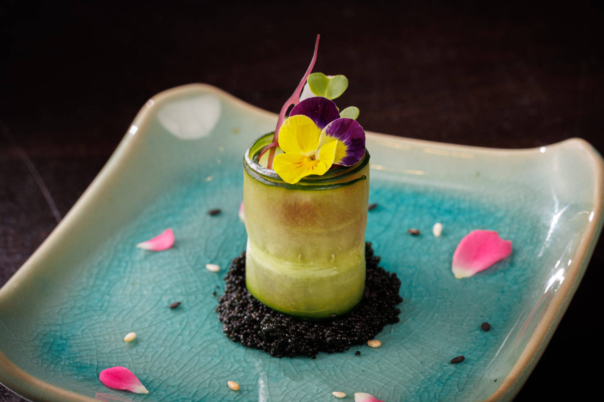Start off with Japanese kaiso seaweed – wolffish — black Biko caviar with Japanese sesame vinegar. This dish may sound like a foreign import, but it features a certain local vegetable best found this time of the year. The vegetables is rich in nutrients and and wrapped in a zucchini while decorated with a bouquet of flowers. This bite sized delight is topped with a decadent scoop of caviar.