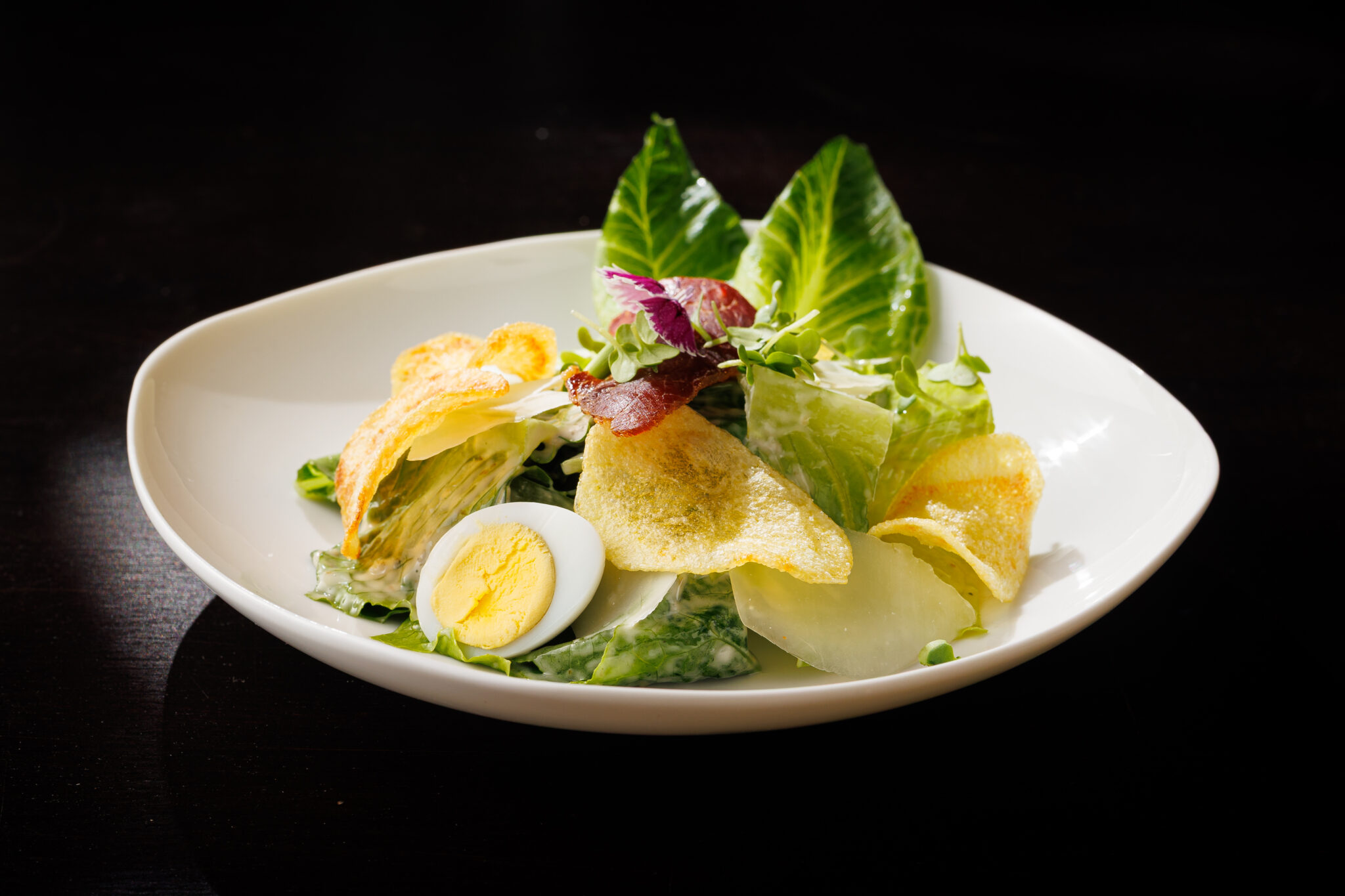 The classic Caesar salad is next, and a medley of the season’s freshest is flavoured with crispy bits of bacon and parnasan.