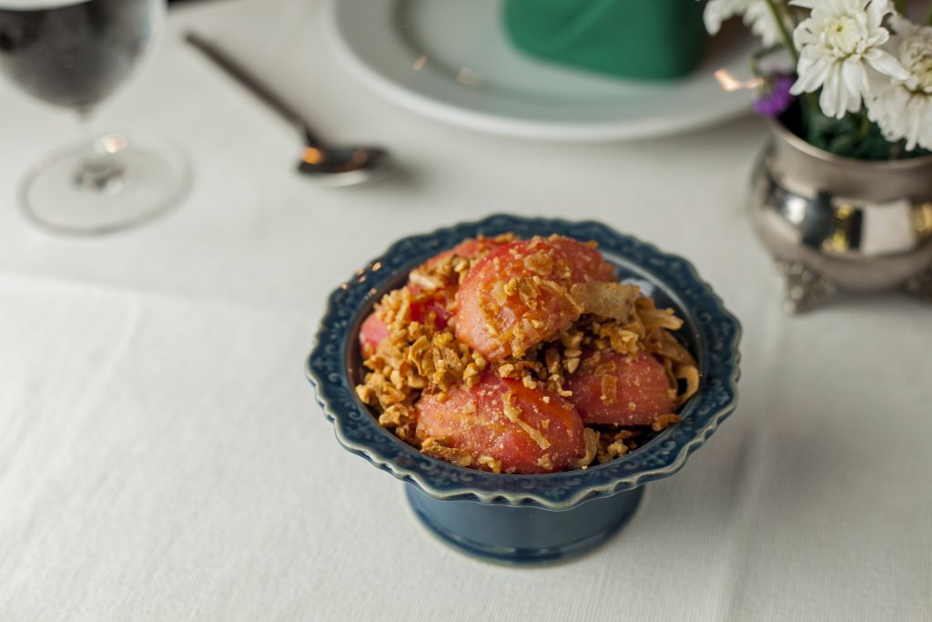 Shan Style Tomato Salad – This is a well-known Shan dish from Myanmar and is a mild salad using fresh tomatoes mixed with nuts and crispy fried garlic. A vegetarian dish, it is a light and bright accompaniment to any meal.
