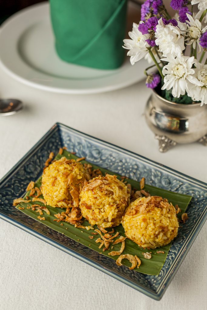 Turmeric Yellow Rice – Aromatic rice is enhanced with fried sliced shallots and seasoned before being rolled into balls for servings. Fresh vegetables, crispy pork rind and hung-le make for a perfect combo.