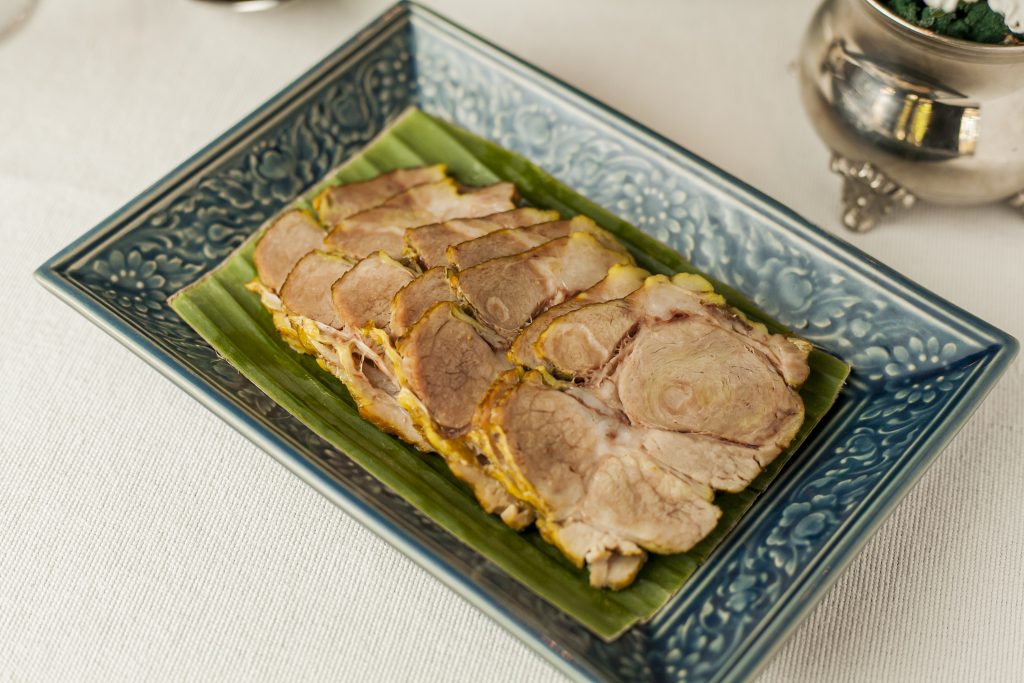 Muu Hum Simmered Pork with Herbs – Tender pork bites are steamed with herbs and flavoured so that the delicious meat simply melts in the mouth. This dish is served with chili dips.