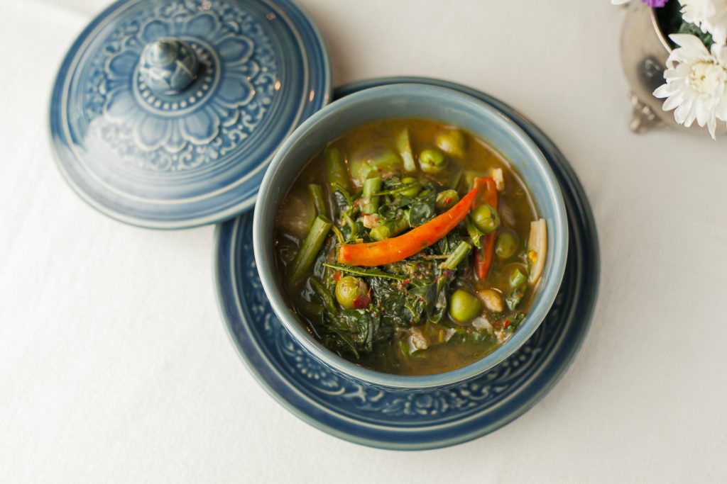 Kaeng Khae Kai, Northern Style Chicken Spicy Soup with Vegetables – This is a super healthy dish which is a local favourite. Traditionally, fresh vegetables plucked from around the garden are used to make a broth which delicately balances the heat, salt and sweet of various herbs. Served with jasmine rice or hot sticky rice.