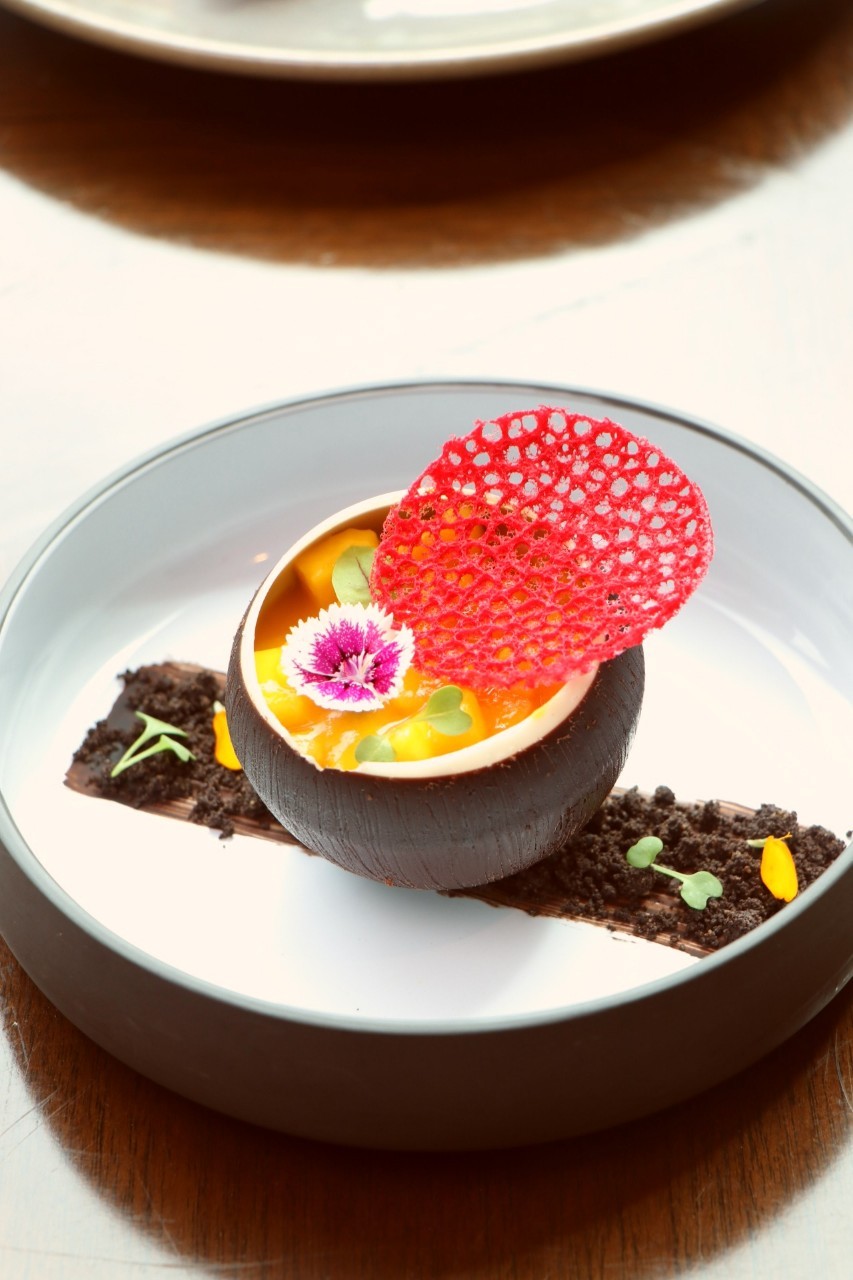 End the meal on a very high note with the Pina Colada mousse which is served with fresh mango, coconut and some deeply satisfying chocolate soil.