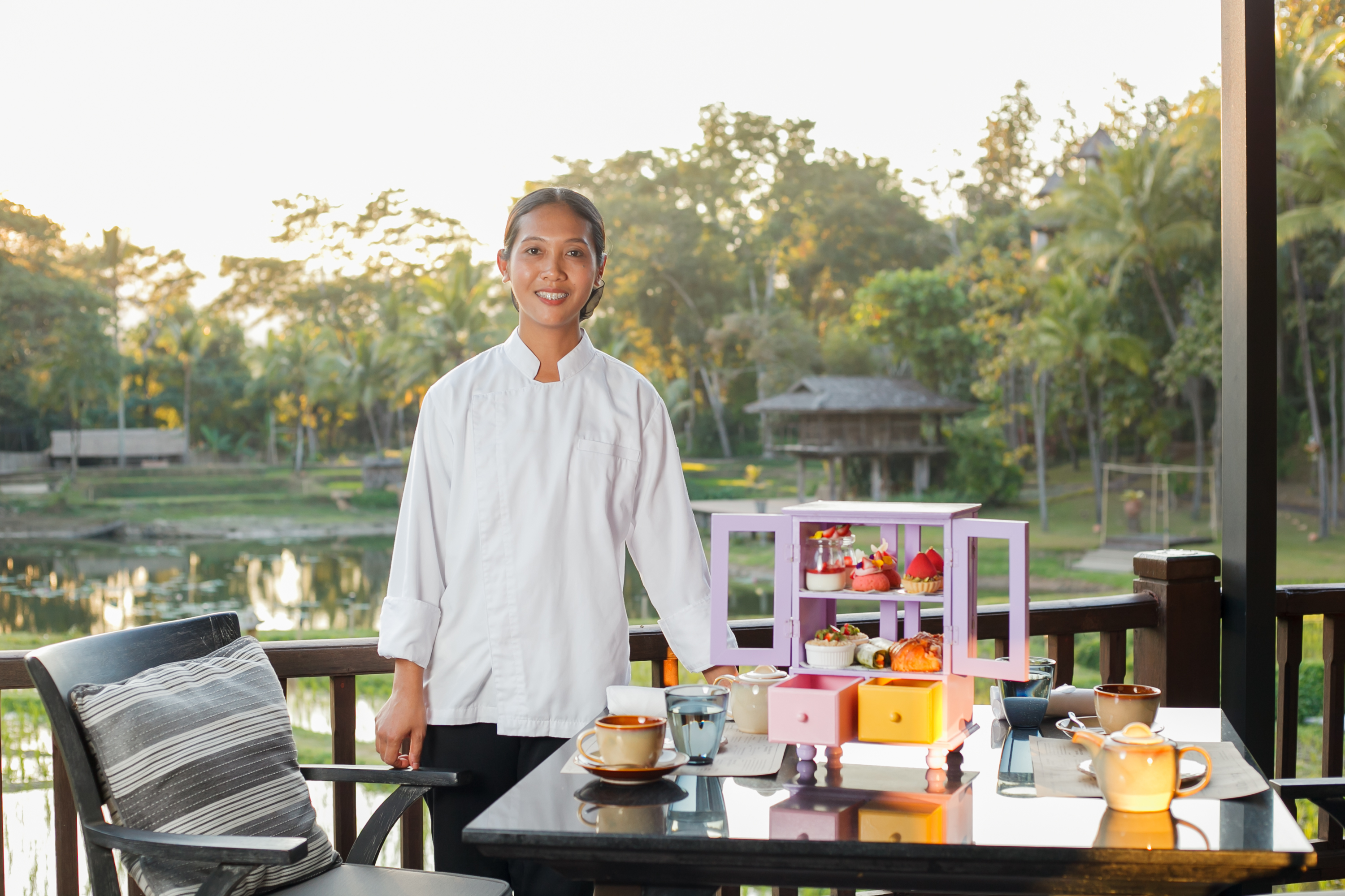 Gaze at the vibrant green paddy fields and looming mountains beyond, sip any of the aromatic and delicious teas on offer, and take your pick from a generous array of tea time treats. The Four Seasons tea experience starts off with both savoury and sweet delights served out of a colourful traditional Thai pantry.