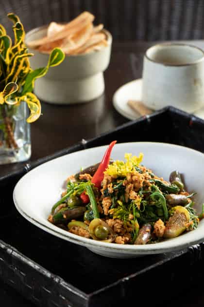 Start off with the yum sanut, a healthy and authentic Northern Thai spicy boiled mixed vegetables salad which bursts with flavours.