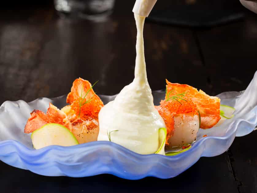 Grilled and immediately served, the large sweet and succulent scollops release aromas of Thai basil oil and is served with potato foam and crispy Parma ham for balance.