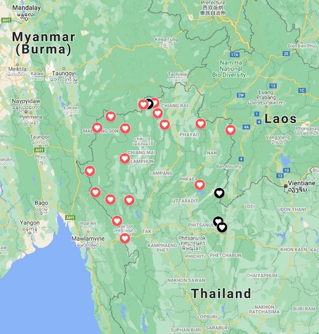 This year, they have distributed donations to seventeen remote, hard-to-access locations (marked with red hearts) in eight Northern provinces, namely Chiang Mai, Chiang Rai, Lamphun, Tak, Nan, Phayao, Mae Hong Son, and Uttaradit. Amongst the beneficiaries are refugees, hill tribes, migrants, and local villagers – people of Lua, Palong, Lahu, Lisu, Karen, Shan, Thai, Burmese, Kayan, and Mien origin. In addition, the Burma Children Medical Fund transported donations on our behalf to newly displaced refugees in Mae Sot, Tak.