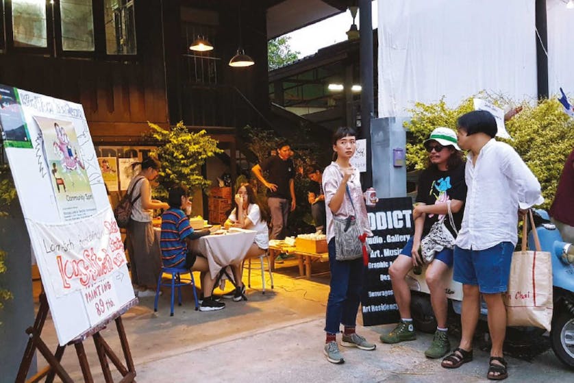 It wasn’t until 1999 that the official Kuan Khama Community was established. “I had noticed that friends in other neighbourhoods were receiving gifts from officials — shirts, blankets, toys for children’s day. I asked why I didn’t get these things and they said, “Because you aren’t a community!” That was when Auntie Air began exploring how to institute a community. It wasn’t long before she managed to recruit 15 members to form a committee, finding herself its leader. However, the hard bit was not establishing it, but running it. She then spent the next three years learning what her role was by attending all the meetings government officials summoned her to. “I can’t really write so I memorise everything and then spread the word,” said Auntie Air. She then started to participate in government-driven projects such as forming the Community Massage Group, forming the Village Health Volunteer (VHV) group, and the Women’s Group. She describes VHV as being a ‘serf for doctors’ – from taking care of bedridden patients to finding water sources where mosquitos breed. Auntie Air went on to say it’s usually the same people doing the work as the younger generation had little interest in participating in community activities. “We live like brothers and sisters. We keep those who are too sick or old to work on the VHV committee so that they can still earn some money,” she said of the 600 baht a month stipend. “The support from government isn’t consistent; it comes and goes,” she continued, explaining that her attention is now focused on a young newbie to the community, an art space called Addict Art Studio, run by a Bangkok man who goes by the name CAS, who moved here eight years ago. Addict Art Studio opened in 2017 and appears to have become an integral part of the community, bringing in fresh new ideas and activities that gets Auntie Air quite excited. Through the launch of the Spark U project, CAS has involved the community in promoting their lifestyle and culture, holding activities such as Lanna Storytelling: Colour of Khuan Khama Community’s Tourism having the former governor opened the activity. “This boy, he lives here so I can be assured that his projects are not going anywhere soon,” said Auntie who has developed a bond with CAS.