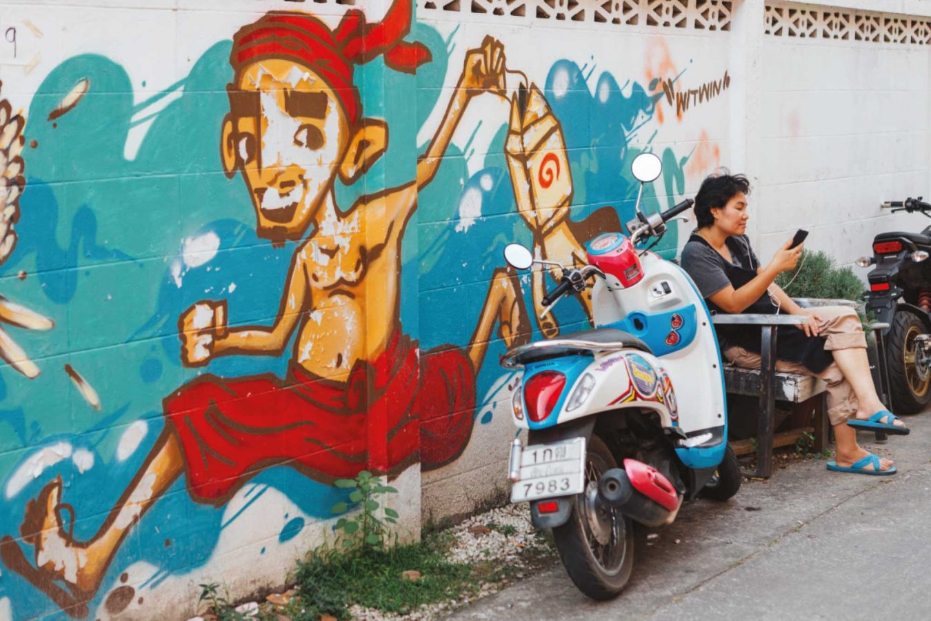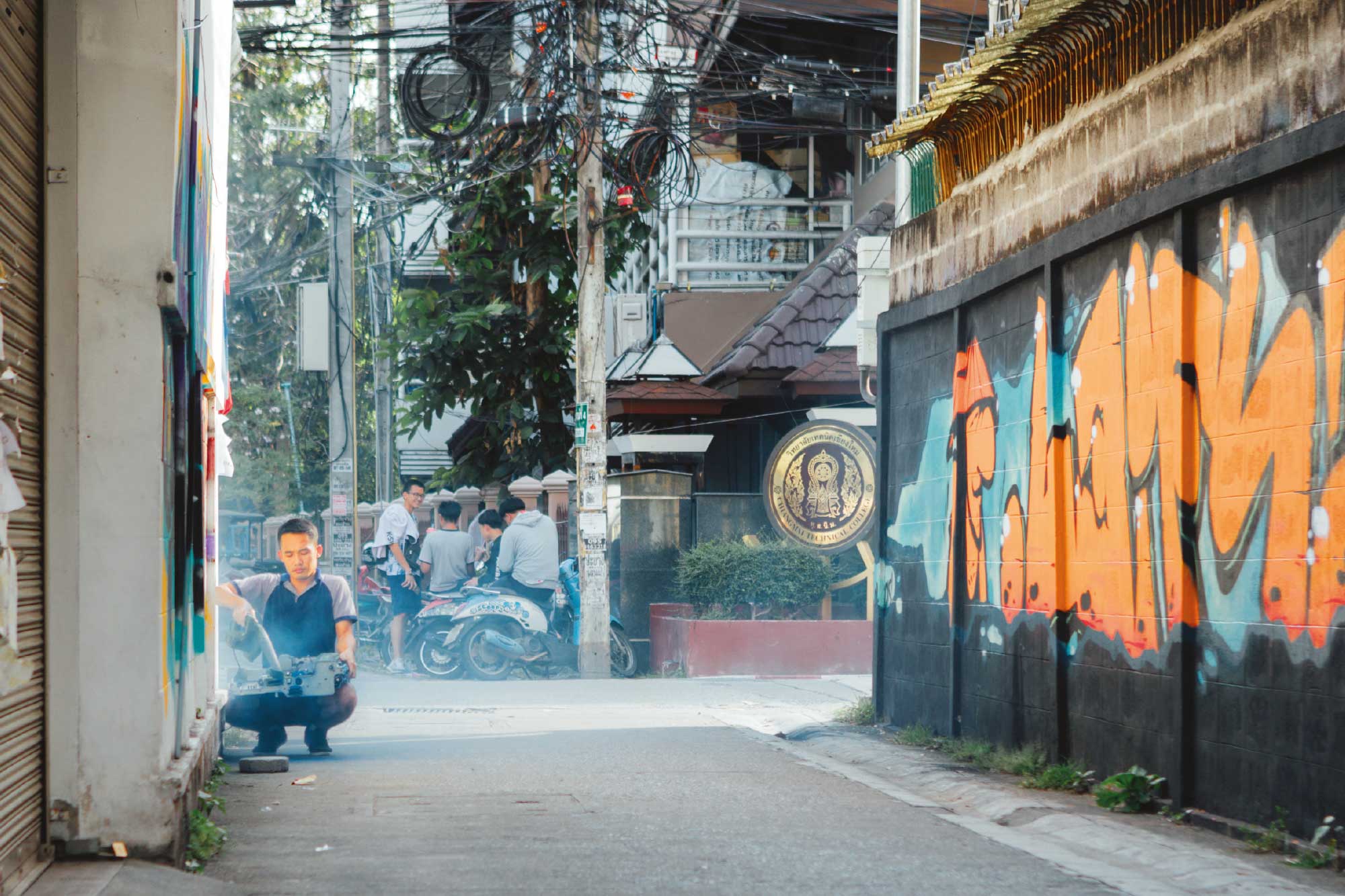 Getting to Addict Studio is like following a trail of graffiti. The studio is a simple two storey wooden house in a small soi off Sri Phum Road surrounded by street art painted on almost every available wall — CAS insists that he always asks permission first. And just across the street is Auntie Tai’s house where many young artists and art lovers seeking graffiti gems sometimes wander into, even at times asking Auntie Tai to cook a simple dish for them. The gates between Auntie Tai and CAS are rarely closed during the day. As we were chatting to the aunties in Auntie’s Tai shady front yard, CAS popped in. “We want to drive this community to weave their own culture into a blend of old traditions and modern art,” said CAS who is in his early 30s. CAS said that he knew no one when he first moved to Chiang Mai, but by reaching out to Thai and international street artists, as well as getting to know his neighbours, he now feels part of a community. Not Everyone’s a Fan “I don’t know what to say. Maybe their parents didn’t teach them well,” sighed the 77 year old abbot in disapproval of CAS and his ilk. “Fewer and fewer people are practicing our old traditions. The young kids are not taught to respect our culture. They can’t even speak kam muang (northern dialect) these days. Only 10 local households regularly visit the temple,” he added sadly.