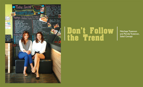 Chiang Mai people have not always been salad eaters and in the past salads were an insignificant garnish splashed with Thousand Island dressing plonked on a side of a plate of pork chop. All that changed when a pair of sisters decided to open a small salad restaurant called Salad Concept. Salad Concept has now established itself as the trend setter in Chiang Mai’s bourgeoning salad scene. Nitchaya Tuwanon (Poy), 31, and Panida Tuwanon (Pay), 29, both local girls, are not your typical stuffy business people. Both young and fresh-faced, Poy and Pay tell us how they were fortunate enough to acquire the ex DVD shop premises on Nimmanheamin Road owned by their father, which they refurbished into the hip and heaving salad joint today.
