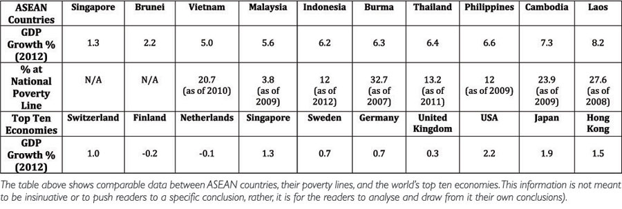 While it should be a relief that ASEAN and the EU aren’t likely to become economically synonymous (well, hopefully not), a developing region’s progression is a delicate web, one in which the disintegration of a few weak strands can leave the whole devastated. In order to better understand, the following table outlines some important albeit slightly boring information (when are statistics ever exciting?) juxtaposing individual GDPs (gross domestic products) and poverty lines.