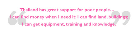 I always find the money. If you know how the system works and you work hard enough, you can get anything you want in Thailand. Thailand has great support for poor people like me. I can find money when I need it; I can find land, buildings; I can get equipment, training and knowledge. It is all available. That is why I don’t bother with silly politics, I just get on with it and fight to empower myself and others.