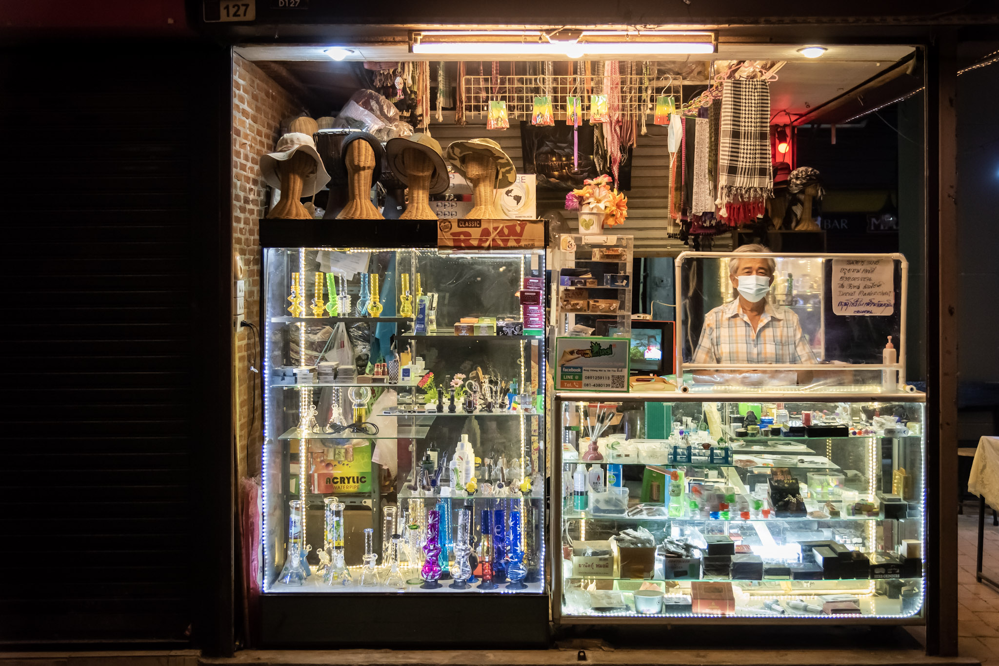 But, while much of the bazaar lies in still darkness, a faint light remains. While out walking and photographing the darkened market one evening I noticed a single shop owner’s stall-light illuminating a small stretch of darkened market stalls. With gray hair, a plaid shirt and arms placed neatly on the counter, he stood in wait for customers. “My shop is called Tib-Tee Shop,” he said from behind a disposable surgical mask, “We sell glass and ceramic souvenirs. Please let me know if I can help you with something.”