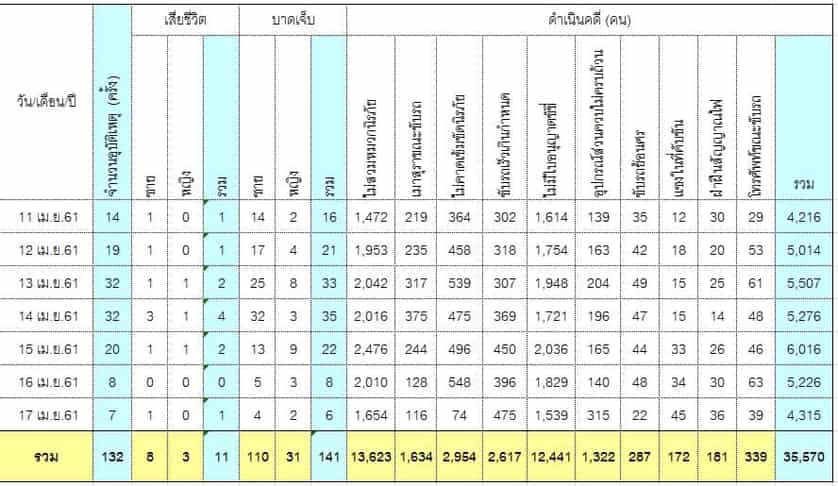 Chiang Mai came up top again in the highest number of injuries at 141 and 11 deaths, but was overtaken by Nakhon Ratchasima this year which recorded a total of 20 deaths from road accidents.