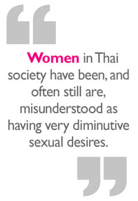 Women in Thai society have been, and often still are, misunderstood as having very diminutive sexual desires, while those that do engender such traits are oft maligned. Independent women are usually portrayed in the media as unscrupulous, dangerous and deceitful. A Thai proverb notes that typical Thai women are both manipulative and cunning even while maintaining kulasatrii standards, saying women possess ‘one hundred wagons full of stratagems’. A woman’s place is to please and service a man’s sexual compulsions while abiding by kulasatrii morals. Jackson writes, “Many women believe that men are often unreliable, unable to make emotional commitments, inefficient in household management and are constantly driven by sexual urges.” In comparison women are forbidden to express themselves sexually, to have sexual desires, sexual independence or disclose romantic relationships – the answer to ‘Do you have a boyfriend’ is more often than not met with a negative.