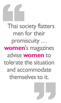 In traditional Thai society – though residual in modern society – women are expected to adhere to the codes of kulasatrii (virtuous lady), to be riap roi, (demure and proper), in view of a man’s assertions. Though of course the double standard is glaring when compared with a man’s necessity for prostitution or ‘bits on the side’ – if women can not sleep around then who can the men sleep with if they are to fulfil their carnal prerogative as chaai chatri – macho gentleman? “Men’s sexual desires are often perceived as insatiable, with an immature, uncontrollable character like a child’s craving, that can hardly be limited to their spouses,” reports the Kinsey Institute on the Thai perspective. The origins of these codes of sexual behaviour date back far into Thai history and have an important place in folk tales, religion and rulership, though even in the present day the Thai media, especially in the soaps, holds fast to these antiquated gender roles. In the book Genders and Sexualities in Modern Thailand2, participants were interviewed from varying social backgrounds about infidelity and the use of prostitutes. The book states that “most women consider this behaviour to be normal,” concerning men visiting prostitutes, though this naturally has a knock on effect where trust is concerned. As Thai men and Thai women often socialise with their own sex, Thai women are tolerant of their husbands spending time with their friends; it was stated by some male survey participants that going out with their wives would be pointless. Jackson’s book points out that often the marriage relationship is far from platonic and often the husband and wife live very separate lives, the man’s other life generally features other women. Concerning prostitutes, a Bangkok middle-class woman stated, “We cannot forbid since men think it’s ordinary,” while a male factory worker responded, “It should be ordinary,” in the same survey. Most women in the survey admitted that they would be tolerant of infidelity as long as he provided for her and did not take a second wife. It is also important to realise that in certain societal environments a man’s promiscuity is often seen as the woman’s problem, her failure in making him contented is her failure in marriage. The purist attitude towards gender roles, unsurprisingly – as the tenets were devised by the patriarchs – seems to confer immunity on the men.