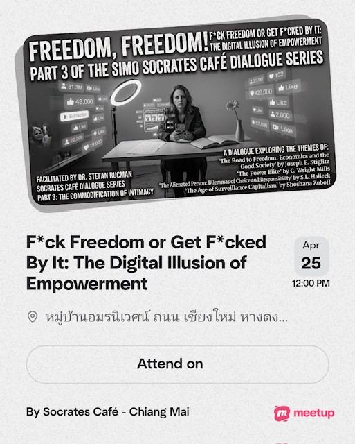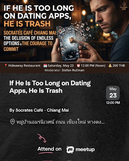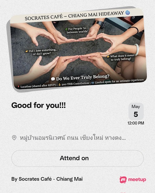 The Chiang Mai chapter has been running for 12 years — originally organised by a Swedish couple and long a staple of the city’s intellectual social scene. It is consistently ranked among the top Socrates Cafés globally. Stefan Ručman (Steven on Meetup), who also organises Chiang Mai Professionals, Expats and Digital Nomads, took over in June 2025 and has continued the tradition.