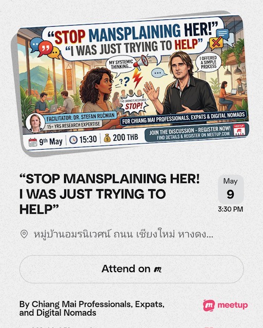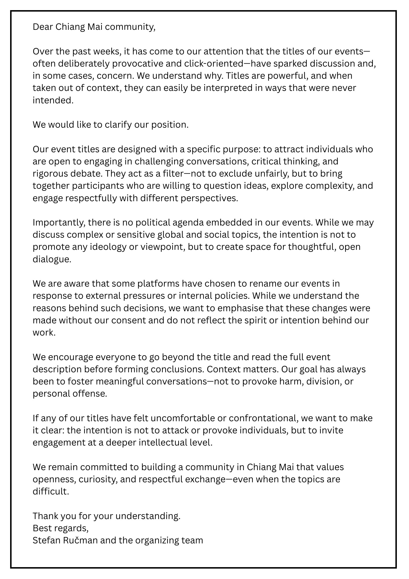 Those titles have recently drawn attention — and in some cases, concern. In an open letter to the Chiang Mai community, Stefan addressed the controversy directly. The provocative style is intentional, he explains: titles are designed to filter in participants who are genuinely open to challenging conversations and critical thinking, not to promote any ideology or cause offence. He also notes that some platforms have renamed events without the organising team’s consent, and that those changes do not reflect the group’s intentions.“Context matters,” Stefan writes. “Our goal has always been to foster meaningful conversations — not to provoke harm, division, or personal offense.”Here is his message in full: