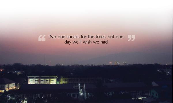 Currently, Chiang Mai’s air pollution has already exceeded The Pollution Control Department’s safe level of 120 micrograms per cubic metre, along with Chiang Rai, Lampang, Phayao and Nan. While 120 is a far cry from China’s unacceptable pollution levels, which have been hovering around the 500 micrograms per cubic metre mark since February, both figures are still too high for the World Health Organisation. Their safe level is a mere 25. “We forget that fresh air is invaluable,” says DiPerna. “We just think it’s a free luxury, or better yet, our right. It’s not; it’s something we have to protect and preserve. No one speaks for the trees, but one day we’ll wish we had.”