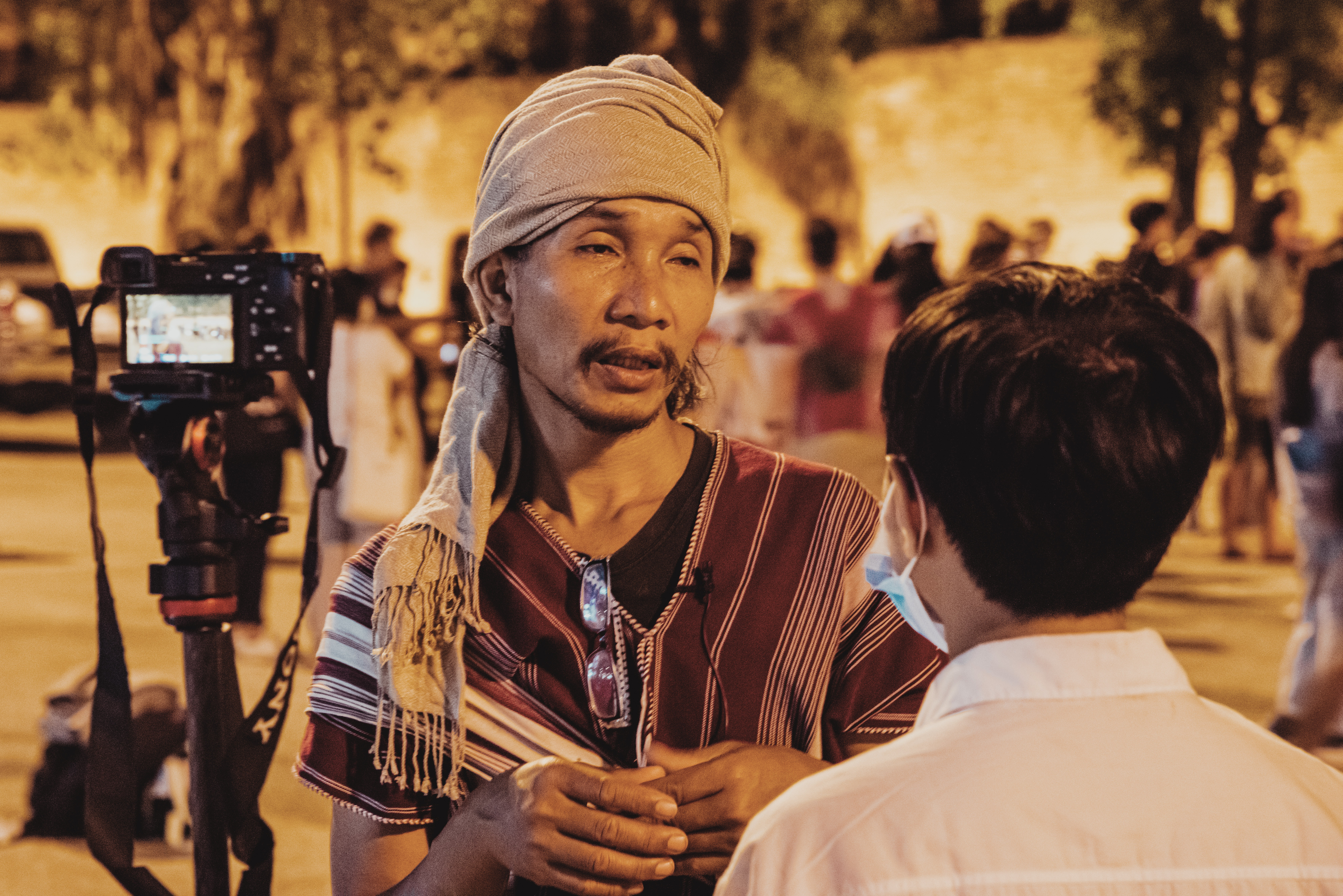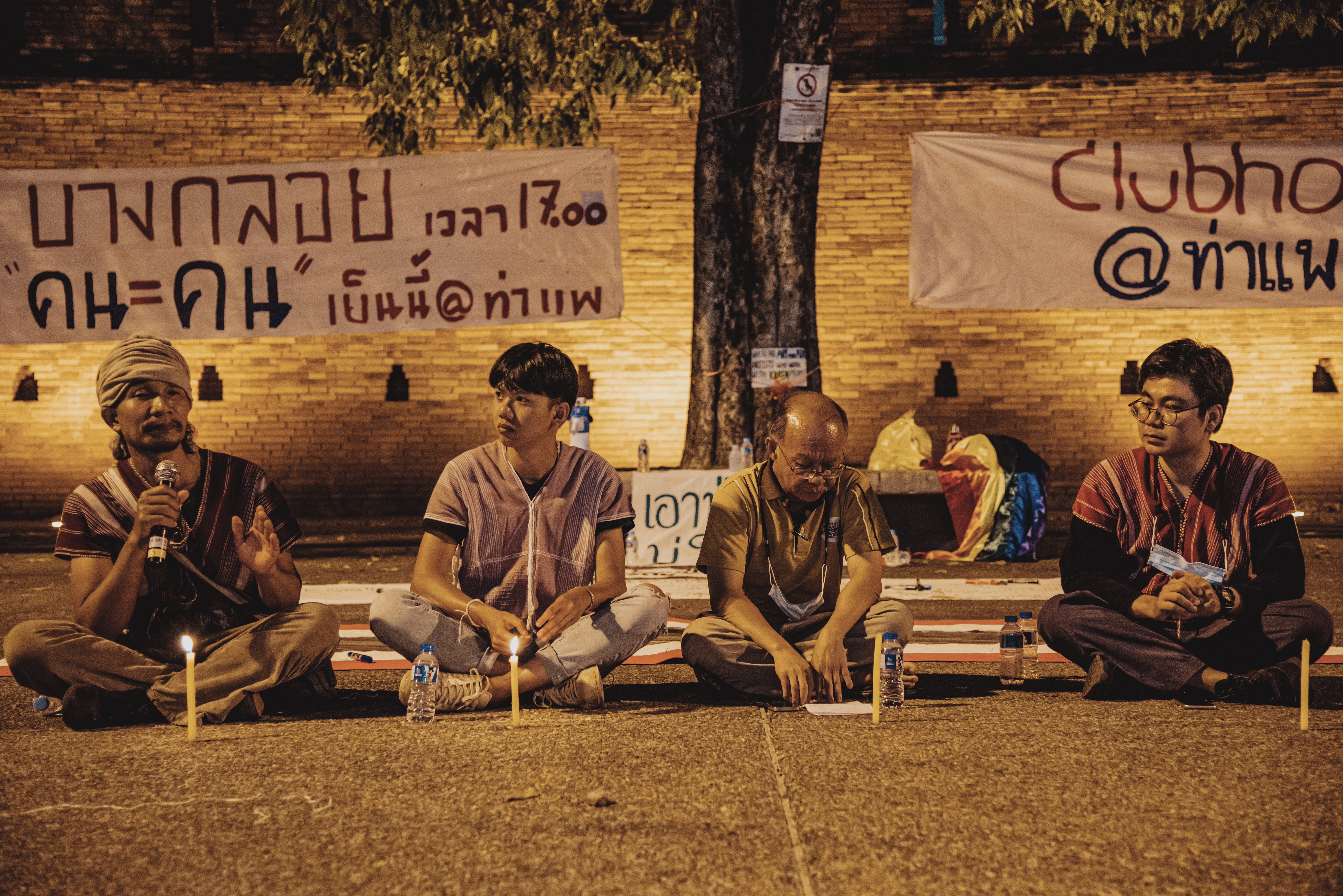 Set under the yellow-tinted lights of Tha Pae Gate, the protester spokesmen and spokeswomen took turns on the microphone. The speakers educated the sitting crowd about the problems facing the Karen villagers. Activist musicians sang songs and the crowd clapped along as passersby watched from the fringes of the crowd. Handmade protest signs, art installations and handwritten messages for the Thai government were located and spread out around the crowd.
