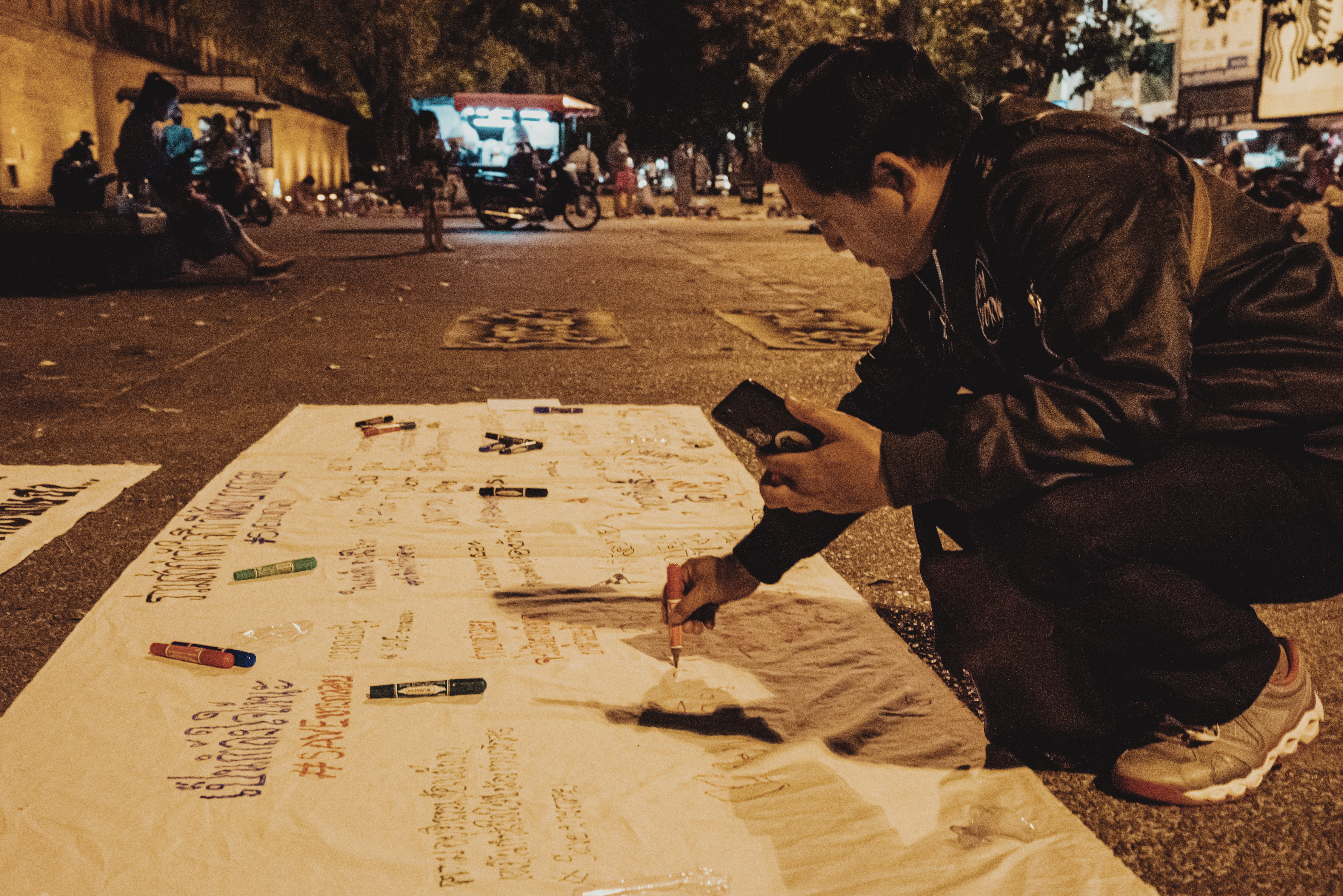 Shortly after 8pm the protest came to an end with one last demonstration. Organisers handed out small candles and people took turns lighting them and placing them in a heart-shaped formation in front of the protest signs. The heart-shaped collection of lit candles spelled out “บ ก” or “B.K” (short for Bang Kloi) and an acoustic musician sang a song until every candle was placed.