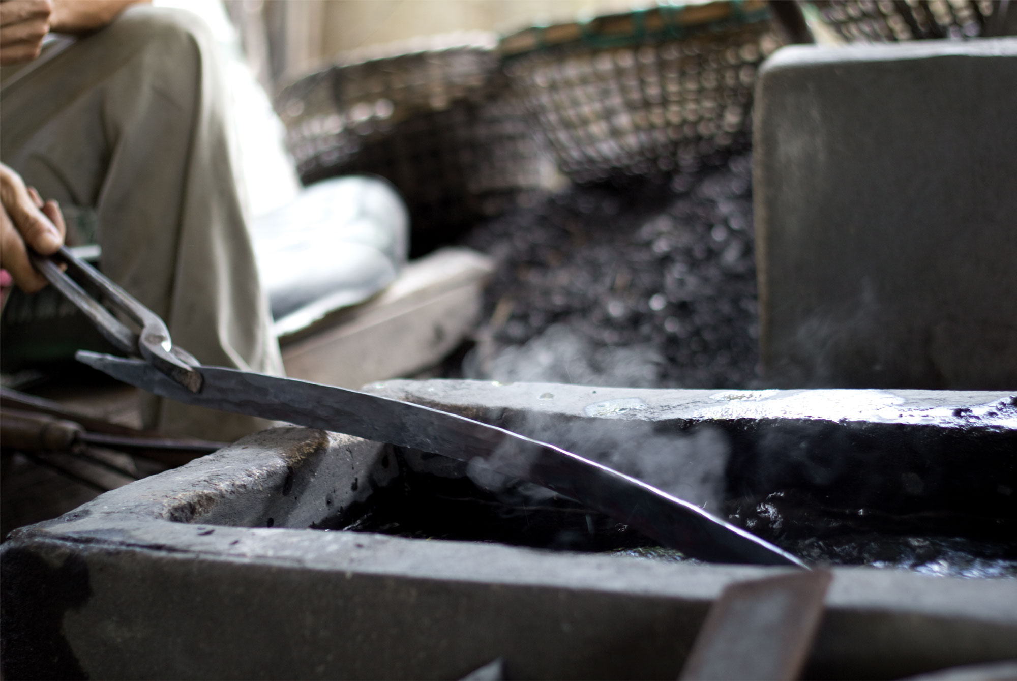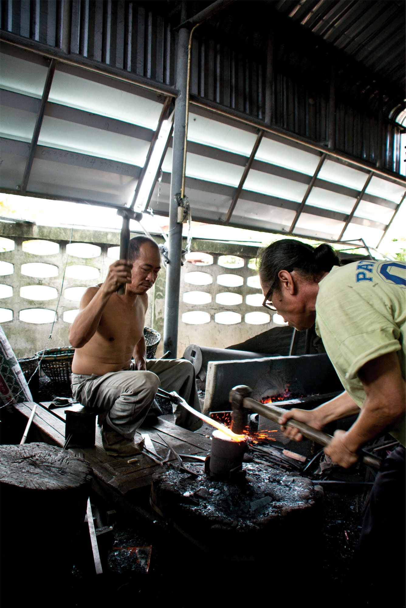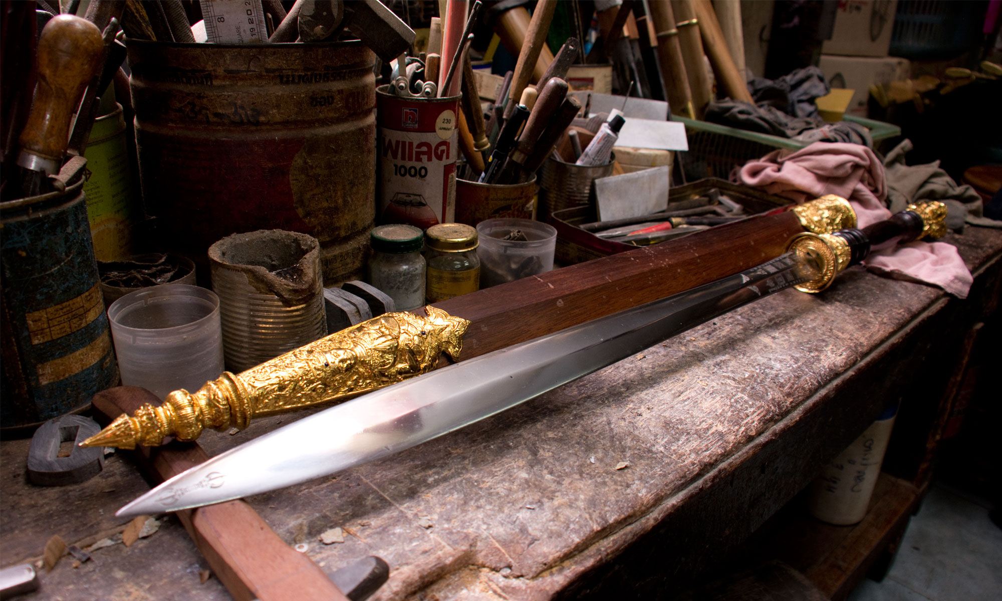 His shop is unassuming for a man who has made swords for the King of Thailand. The space is cluttered with weapons and tools. It’s like stepping into an archaic attic, and the promise of treasures is quickly sated.