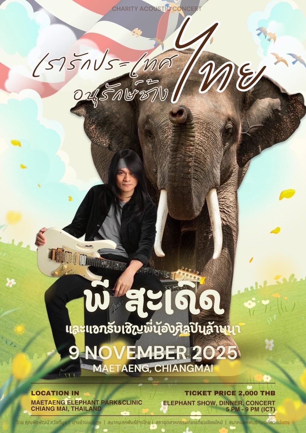 Beloved country rock singer P Saderd (Peerapat Sawatmul) will join forces with numerous artists to host a charity acoustic concert in support of Thai elephants. The event, titled “We Love Thailand: Preserve Thai Elephants”, will take place at Maetaeng Elephant Park in Mae Taeng District on Sunday, 9th November 2025, with proceeds going towards the construction of the Maetaeng Elephant Hospital, under the Faculty of Veterinary Medicine, Chiang Mai University.