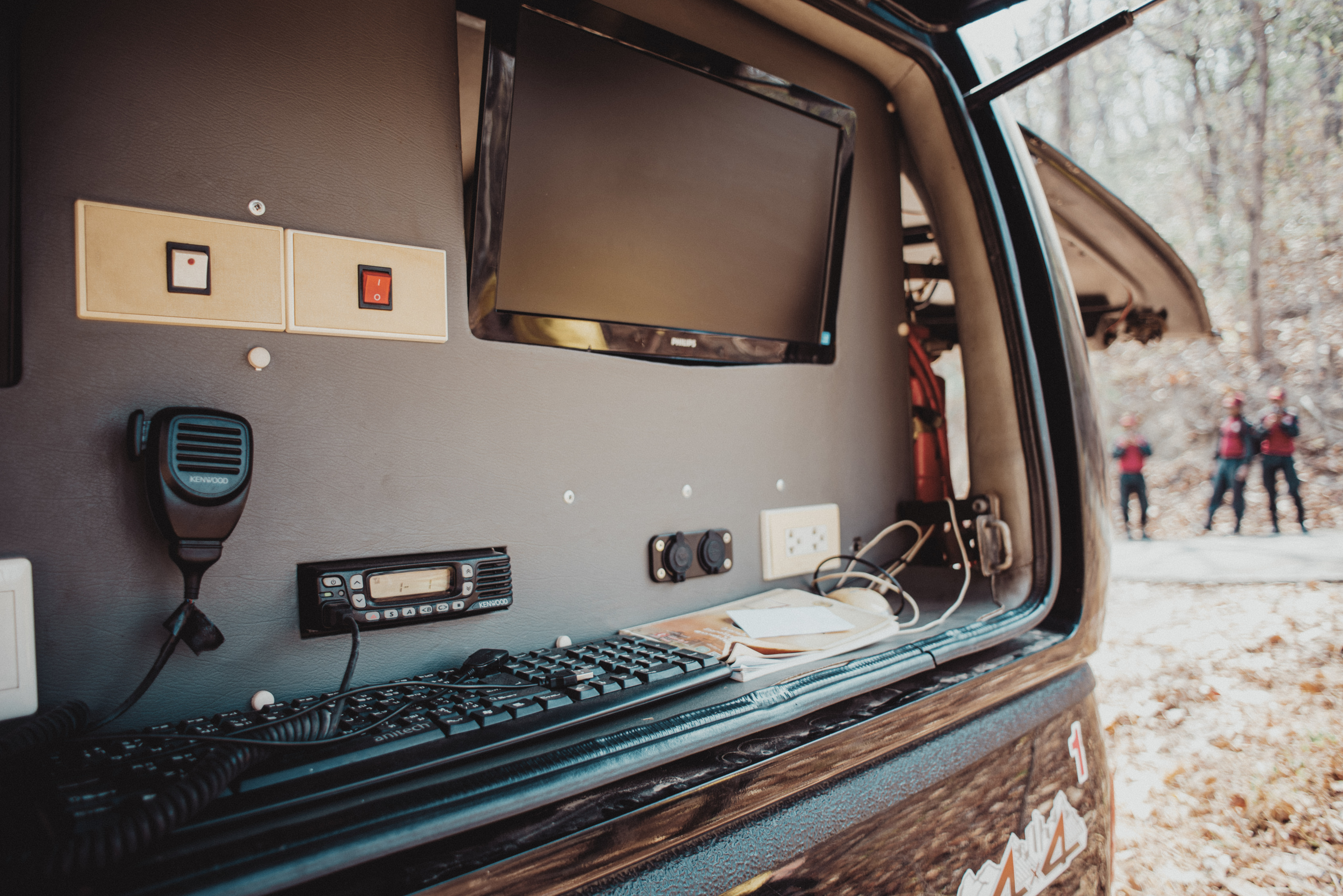 As we arrived at a remote trailhead, the Firehawks leapt into action, unloading their vehicles, putting on their gear and setting up their walkie-talkies – communication being crucial and a matter of life and death. For added safety, a control-unit back at the fire station could observe the team via a GPS tracker and there was a mobile command vehicle equipped with a radio antenna and TV monitors stationed at the trailhead to help maintain a line of contact with the team.