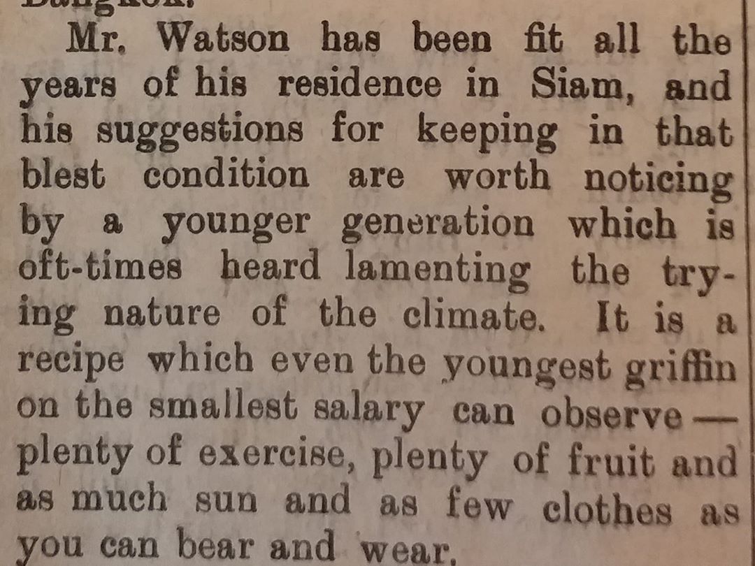 I’m now researching the history of the Anglo-American community in Chiang Mai around 1910-1930 more widely. To do that, I’ve been reading my way through copies of the Bangkok Times (and much else besides) for references to Chiang Mai and its people. It’s going to take a few more months yet, working through the daily issues! Newspapers contain a wealth of information not easily found elsewhere. Cecil Watson was the British Legal Adviser at the International Court in Chiang Mai, and lived here with his family from 1918 to 1923. The Times interviewed him on his retirement after 20 years of service, and here’s what he had to say about keeping fit in the tropical climate.
