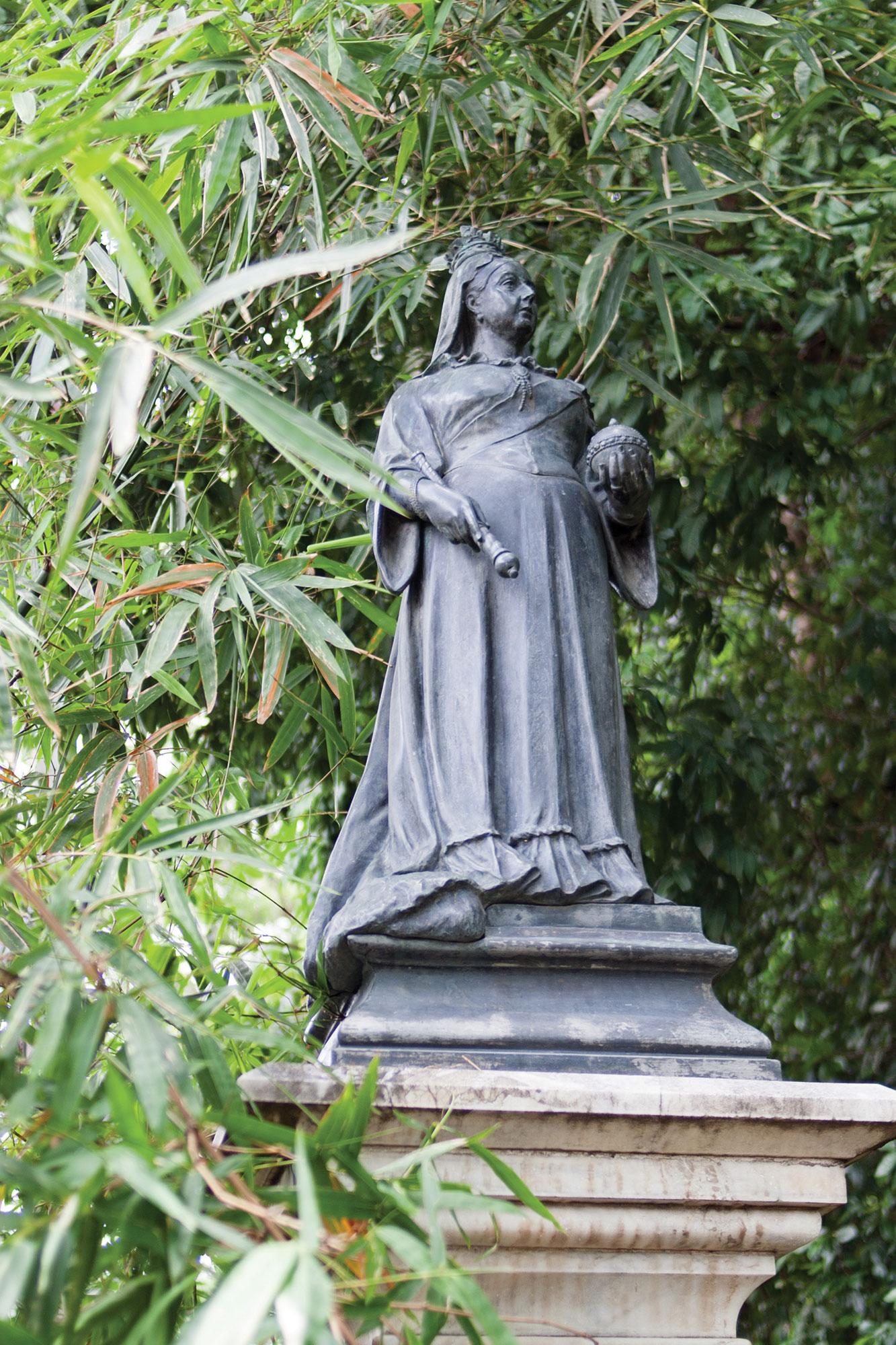 The land is shaped like a pyramid, crowned at its northern tip by a bronze statue of Queen Victoria, her gaze fixed on the small chapel in front of her and the headstones spread out below.
