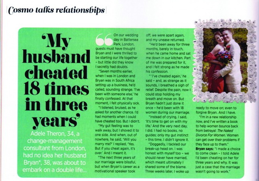 “I was working on massive mergers and acquisitions such as the French/Indian ArcelorMittal merger, which, as you can imagine, was a cultural clash challenge!” Although they would see each other less and less, the pair enjoyed a healthy sex life and were very close friends. But Adele had persistent feelings of unease. One of their mutual friends started buying her a suspicious number of presents for no apparent reason, and Bruce would stay overseas longer and longer after a conference to spend time with new friends. However, each time she brought up the subject, he would accuse her of being paranoid and ask her what was wrong with her, creating endless self-doubt for Adele. “I had no proof, but I felt that I was being lied to,” said Adele. “Eventually I decided to trust my gut feelings. I entered a ten day vipassana meditation course to clear my mind, came home, sat down with Bruce in our kitchen and broke off our marriage. He admitted to two affairs and I asked him to return to South Africa to give me space. I visited three psychiatrists that week, trying to figure out my feelings. I also stayed at home and read a whopping 27 books on dealing with my crisis, I just didn’t know what to do and so I just tried to take in as much information as possible.” A week later Bruce called to say that he couldn’t live with himself and admitted to a total of 18 affairs. A few hours later, one of the psychiatrists Adele visited called to admit that she was one of Bruce’s women. She was to later find out that six of his affairs were with her good friends, and he that had actually fallen in love with three of them. “I couldn’t even contain my anger,” she said of that day. “I threw the phone against the wall and started to break things. I probably would have muddled along like most women in my situation, but I needed a process, that’s just who I am. So I started writing, furiously. I wrote down a programme for me to get through this. I used similar techniques to those I use in change management, but adjusted them for my heartbreak.”