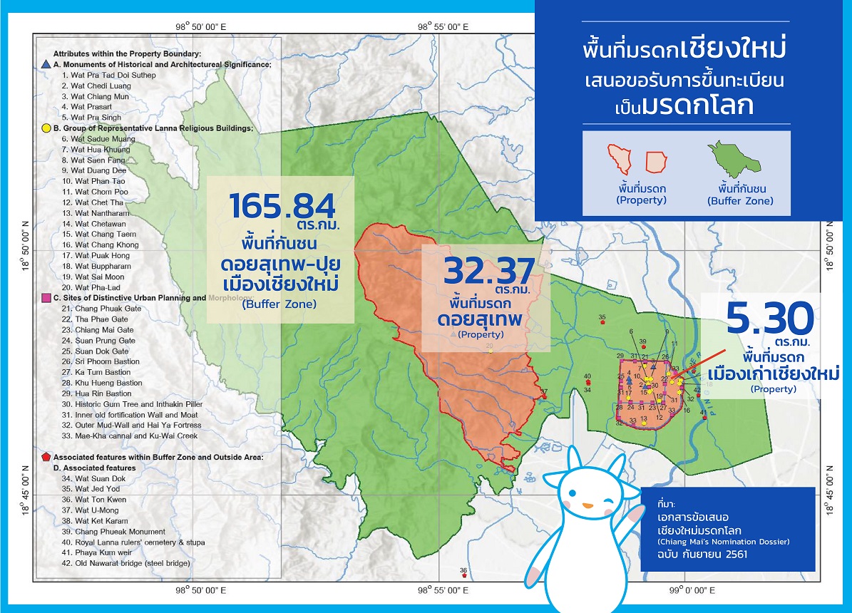 Chiang Mai will be proposed for inscription on UNESCO’s World Heritage List as one property consisting of two complementary components: the historic old city extending to the outer walls and moat including Mae Kha canal (5.30 sq.km.) and the sacred mountain of Doi Suthep, within a buffer zone which covers much of the Doi Suthep-Pui National Park area (165.84 sq.km.). It is a little known fact, but the national park was declared a UNESCO Biosphere Reserve in 1977, which means that it is already in compliance with some of the organisation’s rigorous conservation standards.