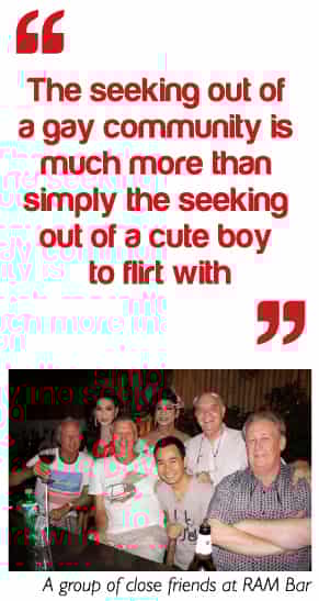 In fact, it wasn’t until I found myself at one of the city’s newest gay spots, Orion Bar, that I actually felt comfortable enough to speak with any of the other patrons. A tiny bar with open walls and TVs streaming videos of ABBA, Orion sits nested deep in the pit of the Night Bazaar, tucked back on Soi 6 of Charoen Prathet Road. The bar is a flood of light and noise. As I enter, owner Komg and his gang of Thai staff are busy hanging a rainbow flag from the entrance. I sit at the bar and order a gin and tonic, which comes to me quick and strong. Every move Komg and his friends make feels like a wink as they flirt their way through the customers. I am the youngest farang by many a decade, though it doesn’t feel as obvious here as it has elsewhere, perhaps because the staff is so young and engaging. After a few sips of my cocktail, I spy a trio of silvery gay men wearing short shorts and chortling over glasses of red wine. Though they are quite obviously a bit older (sorry fellas!) than me, I decide that these gentlemen are my kind of people, so I move to ask them what they think about gay life in the city.