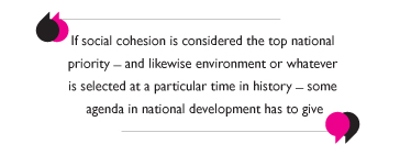 What this tells us is that some kinds of sacrifices are necessary in the allocation of resources. If social cohesion is considered the top national priority – and likewise environment or whatever is selected at a particular time in history – some agenda in national development has to give. We can’t have all the cakes and eat them, as examples below are evident: