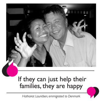 When Danes marry Thai women, they often agree to support not only their new wives, but to some extent also their families back in Thailand. Hathairat has been sending her family more than 5,000 baht every month since she arrived in Denmark.