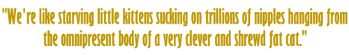 I think you know what consumerism is all about. We, the people, the vast majority of us, are mass consumers. We are in many ways programmed automatons waiting at the end of every production line, ready to spend every last penny, or more often money we don’t have, on what’s trendy, cool, sexy, or at least better than what the neighbour has. We’re like starving little kittens sucking on trillions of nipples hanging from the omnipresent body of a very clever and shrewd fat cat.