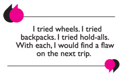 My problem started innocently enough. Many years ago, all you needed when you travelled somewhere on business was a good book or two to pass the time in the evenings. Then laptops came along and had to be lugged with you wherever you went. Weighing the same as a small car, the bag started to become important to help you move around sans hernia.