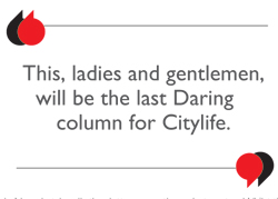 Because with every meeting there must be a corresponding farewell. This, ladies and gentlemen, will be the last Daring column for Citylife. Time for both the magazine and I to move on to new things. It’s been a blast writing for you, I’ve learnt a lot and hope I’ve made you smile occasionally over the last three-and-a-bit years. I know I’ve annoyed people too because the ‘hate’ mail is framed and displayed on my wall with pride. Mrs. D likes to point at it during arguments.