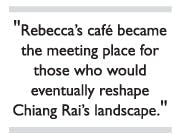 Rebecca’s cafe became the meeting place for those who would eventually reshape Chiang Rai’s landscape. People like great writer and bon vivant Rong Wongsawan, who had a house in Chiang Rai; local legend and arguably Thailand’s most famous living artist Thawan Duchanee; cultural provocateur Nakorn Pongnoi, one of the founders of the Mae Fah Luang Foundation; Wicha Promyong, founder of Doi Chang Coffee; and ceramist Somluk Pantiboon were amongst her customers and friends.