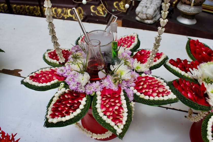 This past Thursday at the Chetuphon Suksa School at Wat Chetuphon, the monk students held the annual Wai Khru Ceremony. The Wai Khru ceremony is a Thai tradition in which students show their gratitude and celebrate their teachers. The day began with students from every class gathering in the school courtyard to make unique flower arrangements. The students showed intense dedication to these arrangements, spending nearly two hours creating their ornate and detailed creations. After breaking for lunch, the monk students lined up to commence the ceremony inside the school. The ceremony consisted of prayer, speeches, and then the presentation of the flower arrangements to both monk and non-monk teachers.