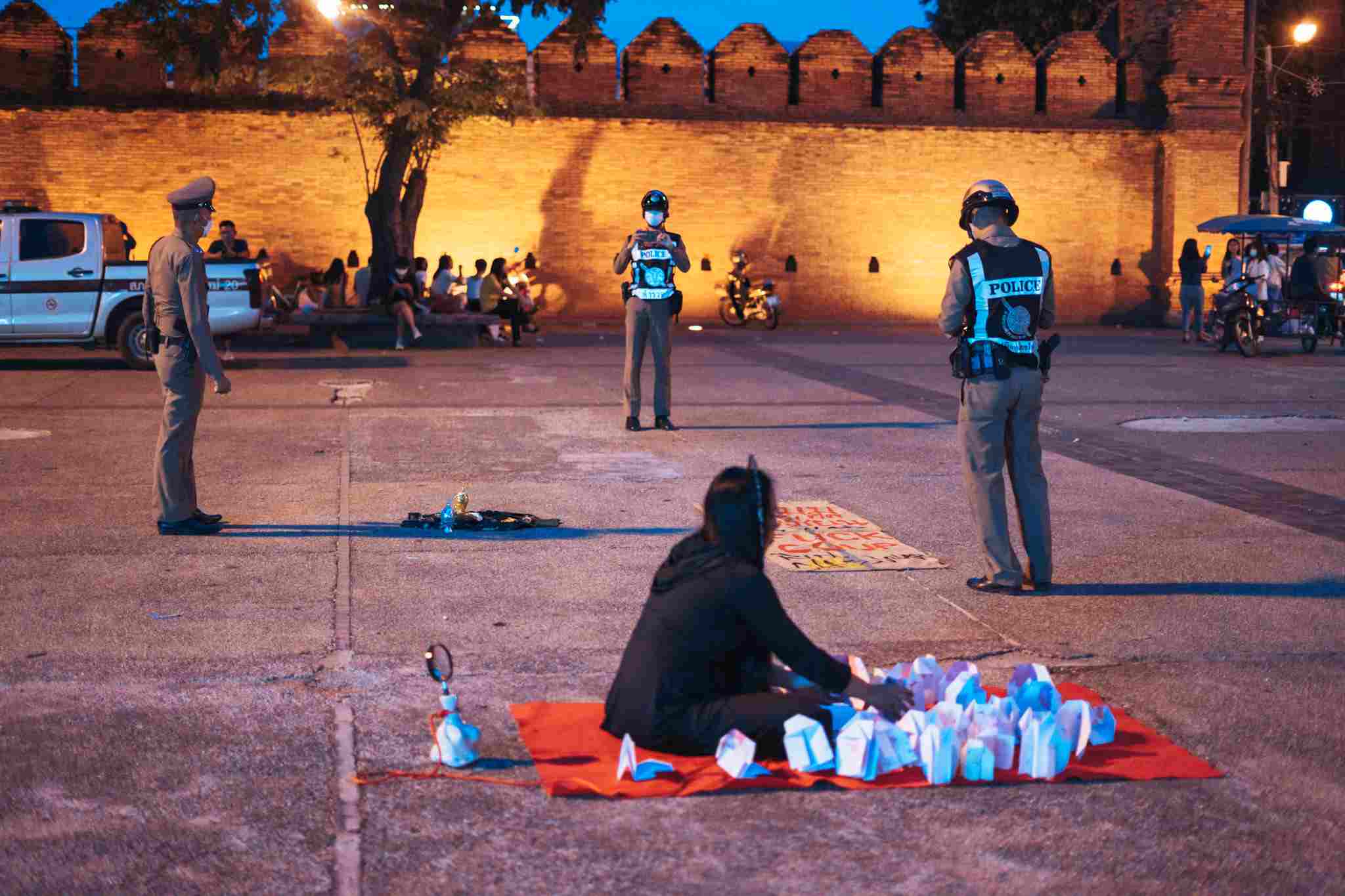 As with almost every protest that occurs at Tha Pae gate, local police arrived. At around 7pm a police officer armed with a gun arrived on a bicycle to inspect the messages taped to the famous monument. Shortly after, a truck of police officers and a few motorcycle officers arrived to take photographs of the performers and their installations.