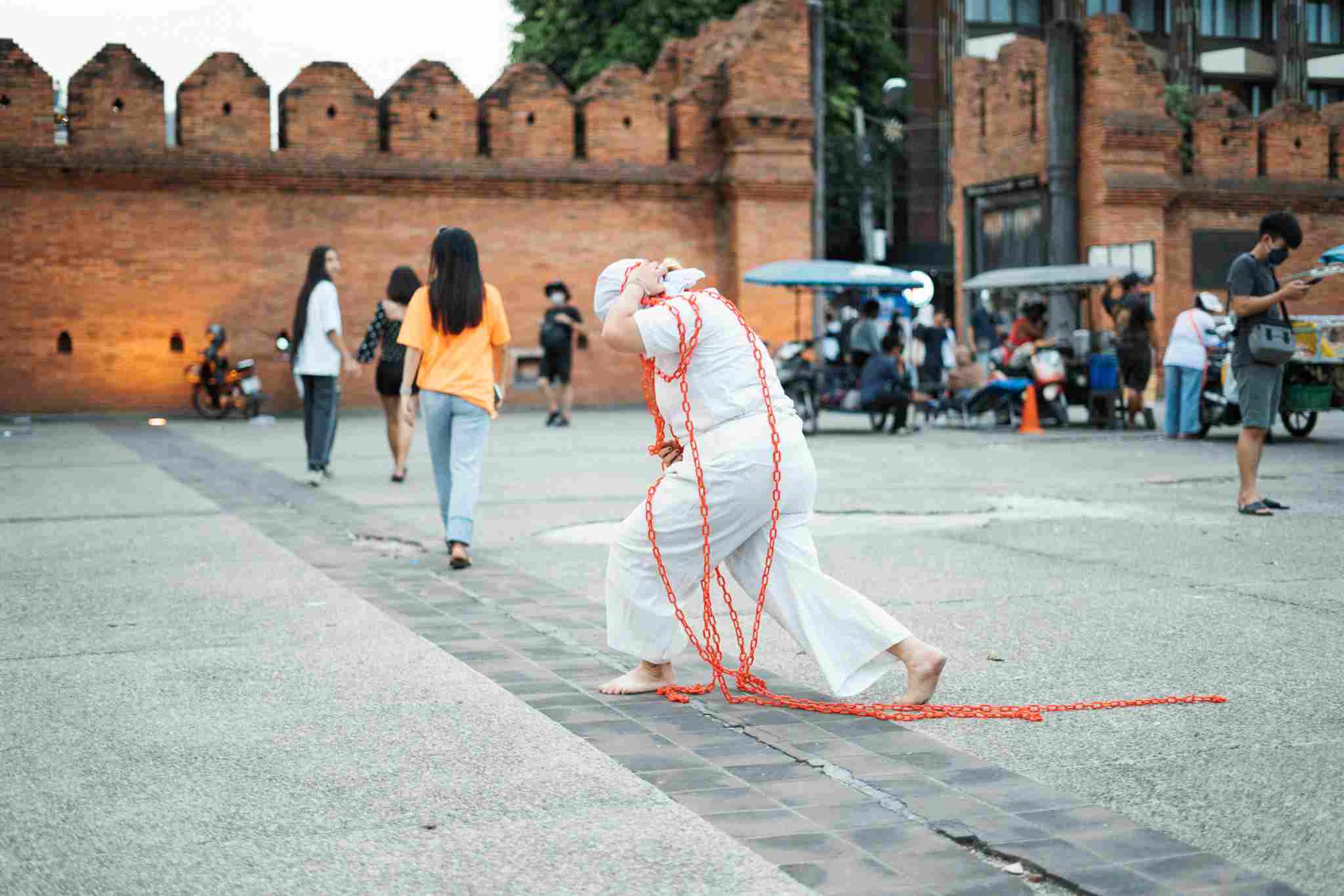 25 year old Nontawat Machai, a Lanyim Theatre performer, said, “The show today talks about using military force to wage war on people. By using Buddhism to create righteousness in killing dissenters such as in Myanmar and Thailand.” Nontawat has been performing with Lanyim for six years and was dressed as a Buddhist monk, “The materials I used for the show are monks’ robes, sarongs, and a toy tank. These are the main materials for working with my body.” Passersby watched as Nontawat performed as a monk who controlled a toy tank spread on the ground at Tha Pae Gate.